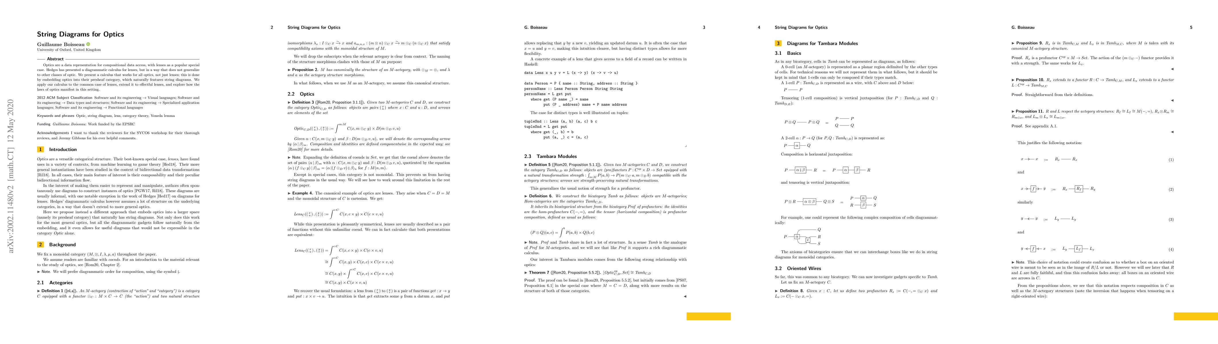 This paper introduces a string diagram calculus for all optics, generalizing beyond lenses, by embedding optics into their presheaf category. The authors extend the calculus to effectful lenses and analyze how optic laws apply in this context.