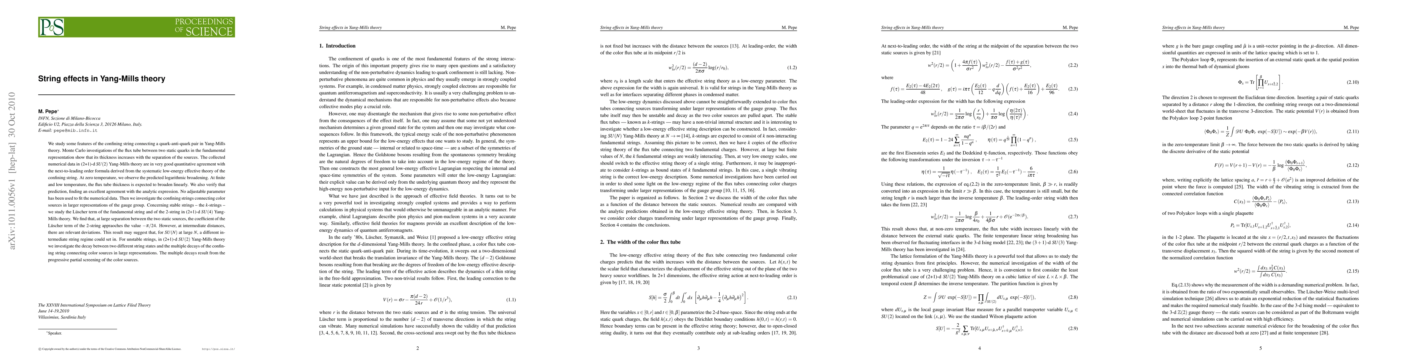 We study some features of the confining string connecting a quark-anti-quark pair in Yang-Mills theory. Monte Carlo investigations of the flux tube between two static quarks in the fundamental representation show that its thickness increases with the separation of the sources. The collected numerical data in (2+1)-d SU(2) Yang-Mills theory are in very good quantitative agreement with the next-to-leading order formula derived from the systematic low-energy effective theory of the confining string. At zero temperature, we observe the predicted logarithmic broadening. At finite and low temperature, the flux tube thickness is expected to broaden linearly. We also verify that prediction, finding an excellent agreement with the analytic expression. No adjustable parameter has been used to fit the numerical data. Then we investigate the confining strings connecting color sources in larger representations of the gauge group. Concerning stable strings -- the k-strings -- we study the Luscher term of the fundamental string and of the 2-string in (2+1)-d SU(4) Yang-Mills theory. We find that, at large separation between the two static sources, the coefficient of the Luscher term of the 2-string appraoches the value -pi/24. However, at intermediate distances, there are relevant deviations. This result may suggest that, for SU(N) at large N, a different intermediate string regime could set in. For unstable strings, in (2+1)-d SU(2) Yang-Mills theory we investigate the decay between two different string states and the multiple decays of the confining string connecting color sources in large representations. The multiple decays result from the progressive partial screening of the color sources.