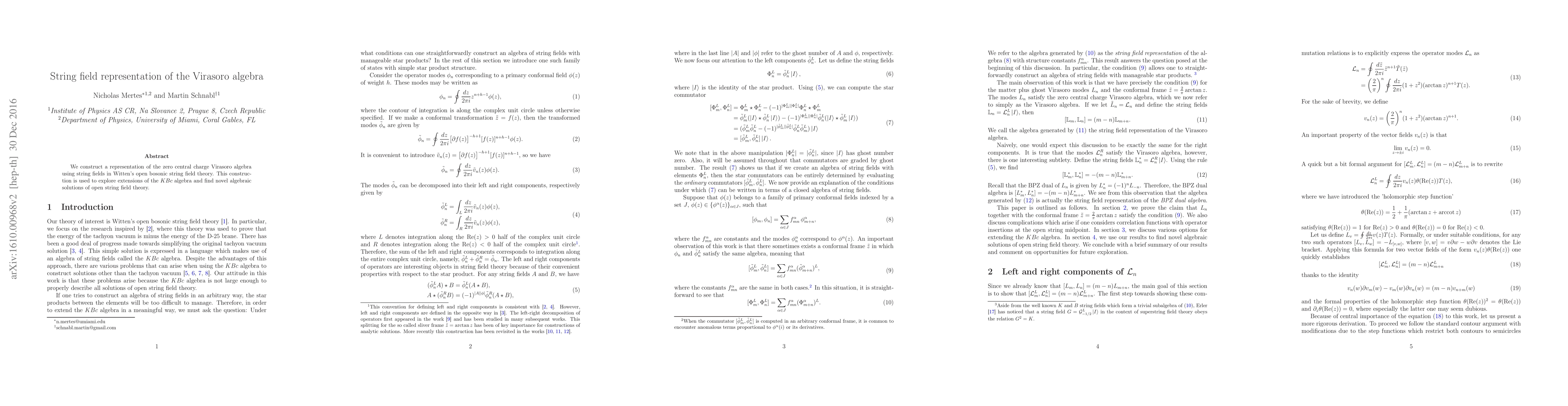 Summary: The paper constructs a string field representation of the zero central charge Virasoro algebra in Witten's open bosonic string field theory and utilizes it to explore extensions of the KBc algebra, leading to new solutions in open string field theory.