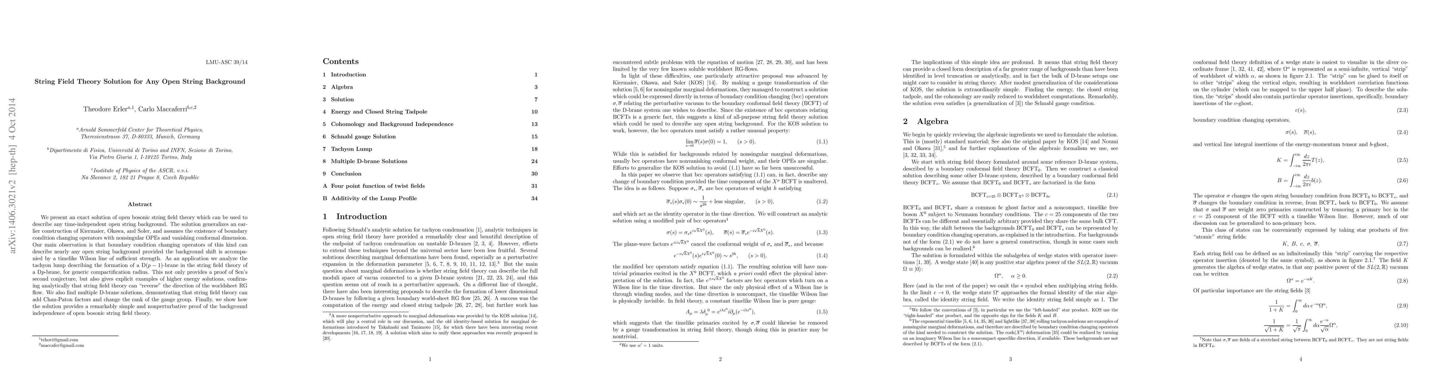 We present an exact solution of open bosonic string field theory which can be used to describe any time-independent open string background. The solution generalizes an earlier construction of Kiermaier, Okawa, and Soler, and assumes the existence of boundary condition changing operators with nonsingular OPEs and vanishing conformal dimension. Our main observation is that boundary condition changing operators of this kind can describe nearly any open string background provided the background shift is accompanied by a timelike Wilson line of sufficient strength. As an application we analyze the tachyon lump describing the formation of a D$(p-1)$-brane in the string field theory of a D$p$-brane, for generic compactification radius. This not only provides a proof of Sen's second conjecture, but also gives explicit examples of higher energy solutions, confirming analytically that string field theory can "reverse" the direction of the worldsheet RG flow. We also find multiple D-brane solutions, demonstrating that string field theory can add Chan-Paton factors and change the rank of the gauge group. Finally, we show how the solution provides a remarkably simple and nonperturbative proof of the background independence of open bosonic string field theory.