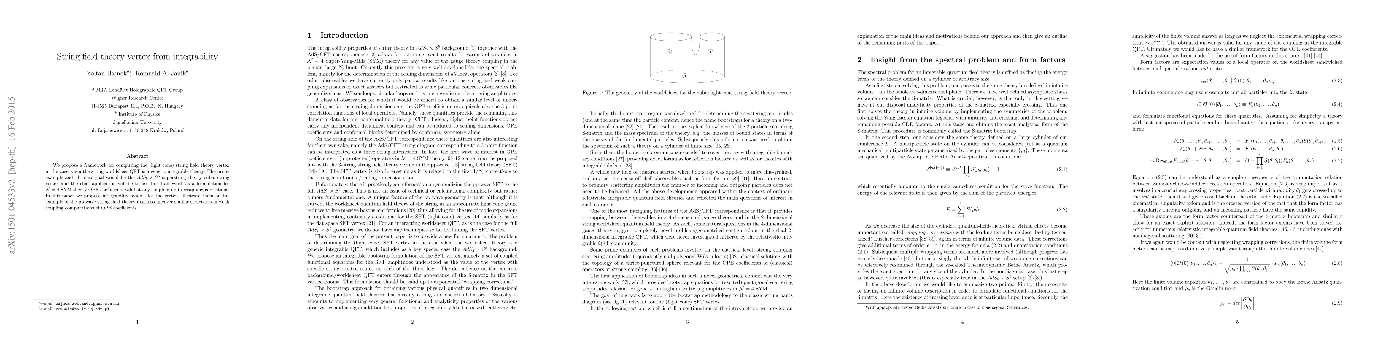The paper proposes a framework for computing the string field theory vertex in integrable worldsheet theories, with a focus on the AdS_5 x S^5 superstring theory and its relation to N=4 SYM theory OPE coefficients.