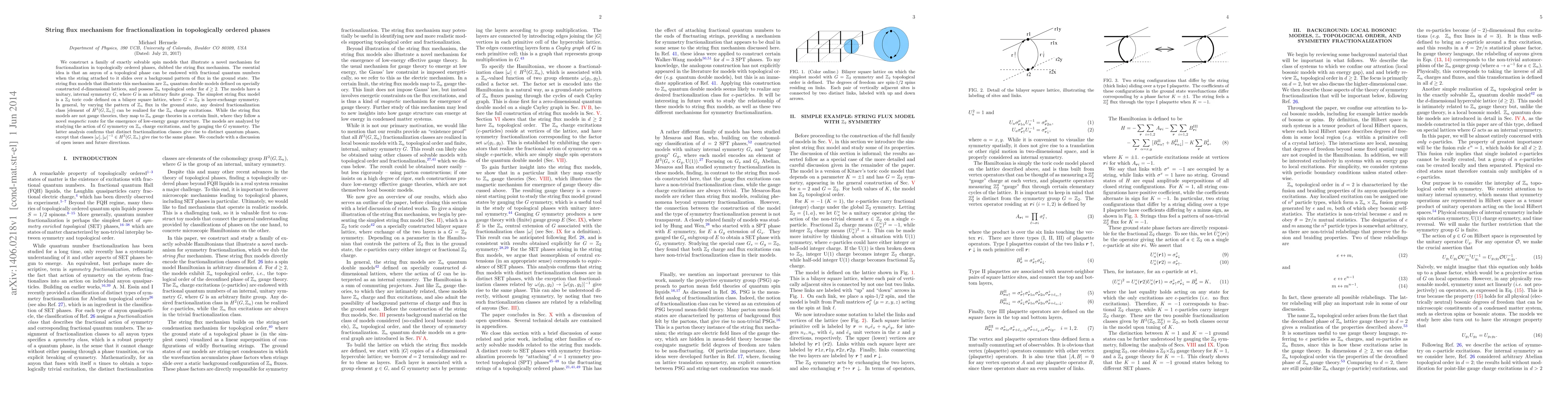 This paper introduces the string flux mechanism for fractionalization in topologically ordered phases, demonstrating it through exactly solvable spin models. These models, particularly $Z_n$ quantum double models, show how anyons can acquire fractional quantum numbers by sliding over flux patterns in the ground state, leading to $Z_n$ topological order.
