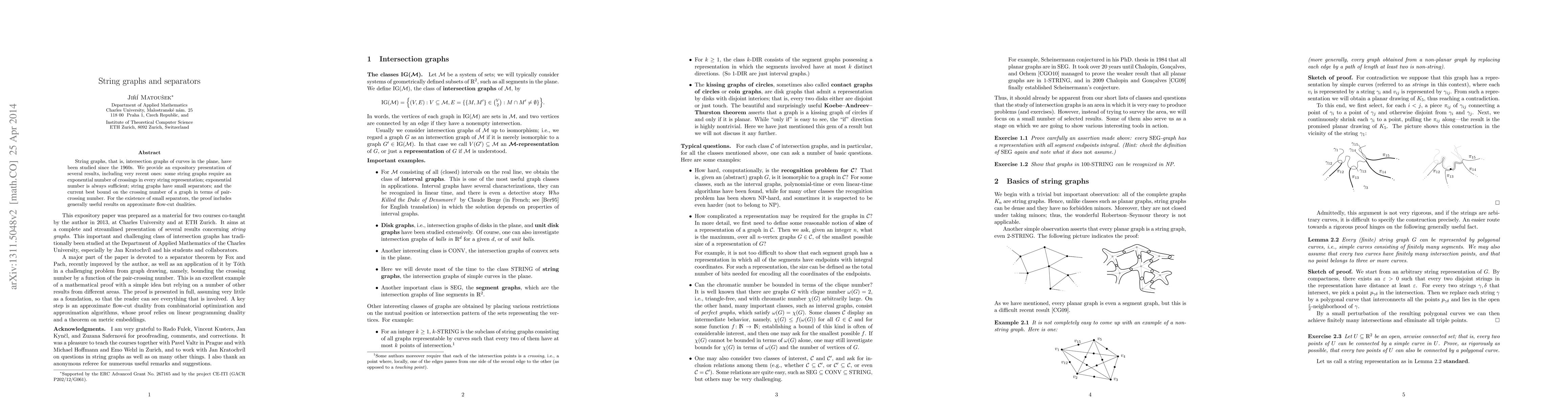 String graphs, that is, intersection graphs of curves in the plane, have been studied since the 1960s. We provide an expository presentation of several results, including very recent ones: some string graphs require an exponential number of crossings in every string representation; exponential number is always sufficient; string graphs have small separators; and the current best bound on the crossing number of a graph in terms of the pair-crossing number. For the existence of small separators, unwrapping the complete proof include generally useful results on approximate flow-cut dualities.