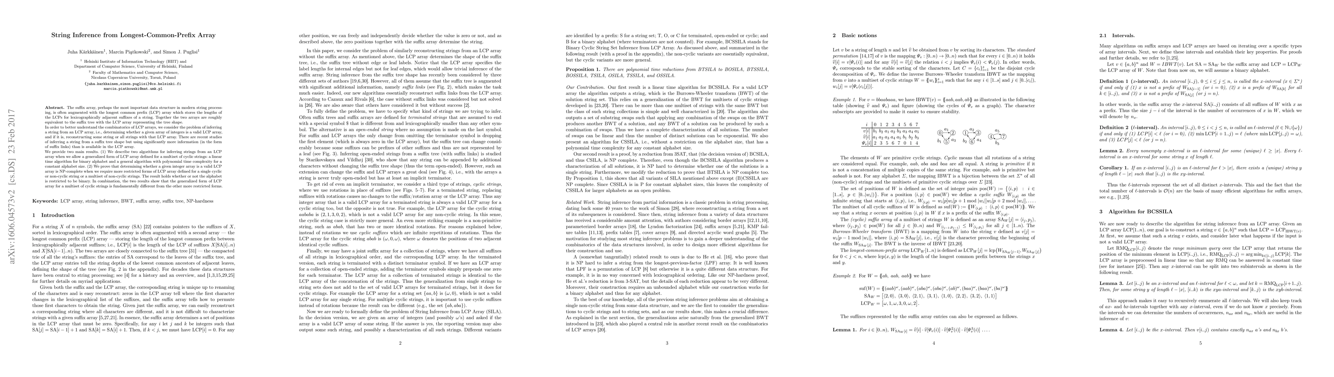 This paper explores algorithms for inferring strings from LCP arrays, which represent the longest common prefixes of adjacent suffixes. It presents linear time and polynomial time algorithms for generalized LCP arrays of cyclic strings and proves that determining the validity of restricted LCP arrays is NP-complete.