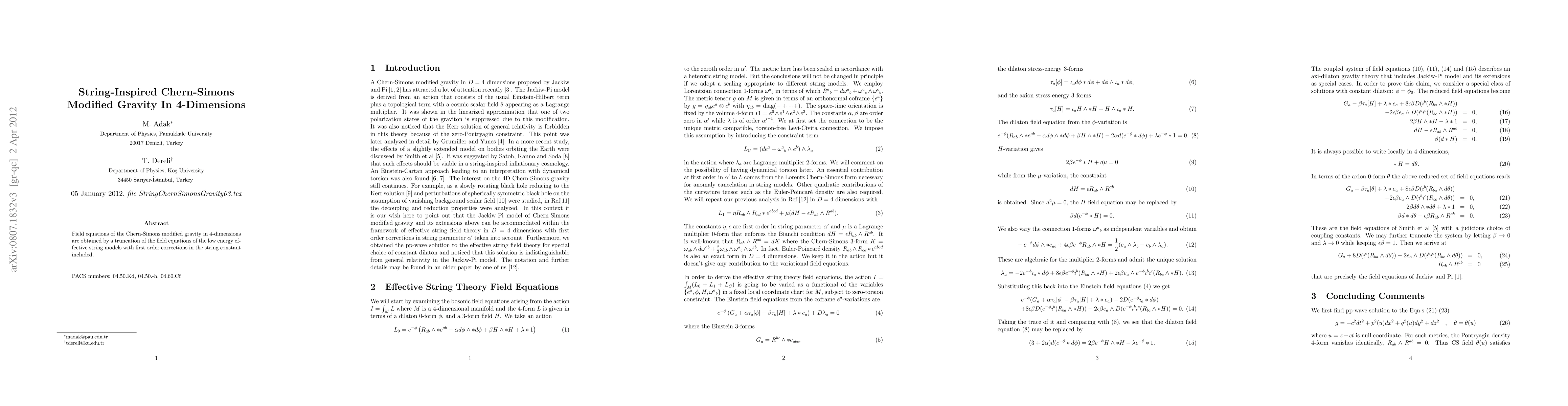 Summary: This paper demonstrates that Chern-Simons modified gravity in 4-dimensions can be derived from low energy effective string models to first order in the string constant, highlighting their equivalence as theoretical frameworks.