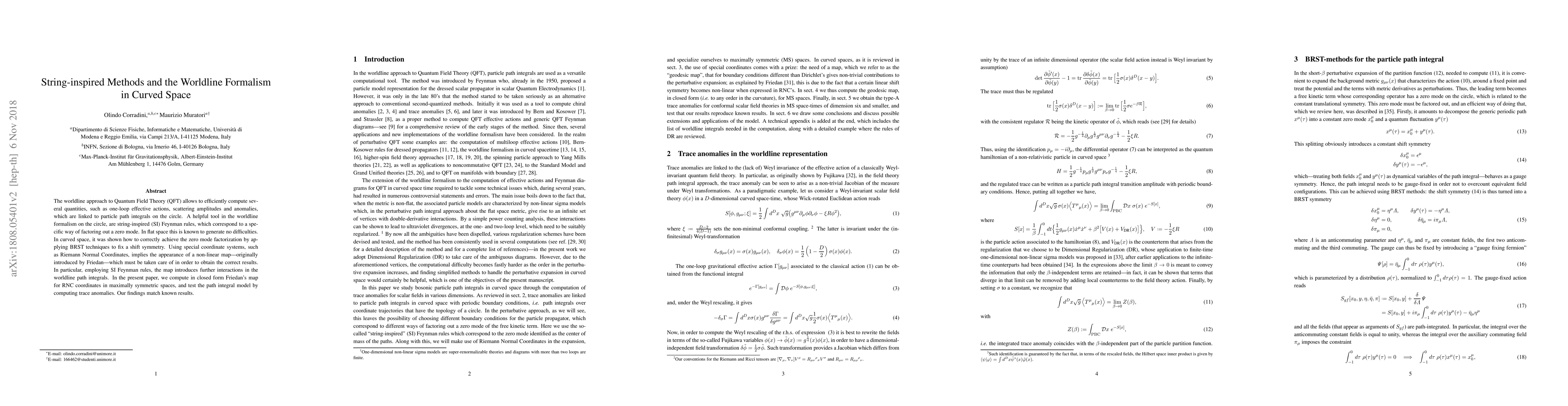 The worldline approach to Quantum Field Theory (QFT) allows to efficiently compute several quantities, such as one-loop effective actions, scattering amplitudes and anomalies, which are linked to particle path integrals on the circle. A helpful tool in the worldline formalism on the circle, are string-inspired (SI) Feynman rules, which correspond to a specific way of factoring out a zero mode. In flat space this is known to generate no difficulties. In curved space, it was shown how to correctly achieve the zero mode factorization by applying BRST techniques to fix a shift symmetry. Using special coordinate systems, such as Riemann Normal Coordinates, implies the appearance of a non-linear map---originally introduced by Friedan---which must be taken care of in order to obtain the correct results. In particular, employing SI Feynman rules, the map introduces further interactions in the worldline path integrals. In the present paper, we compute in closed form Friedan's map for RNC coordinates in maximally symmetric spaces, and test the path integral model by computing trace anomalies. Our findings match known results.