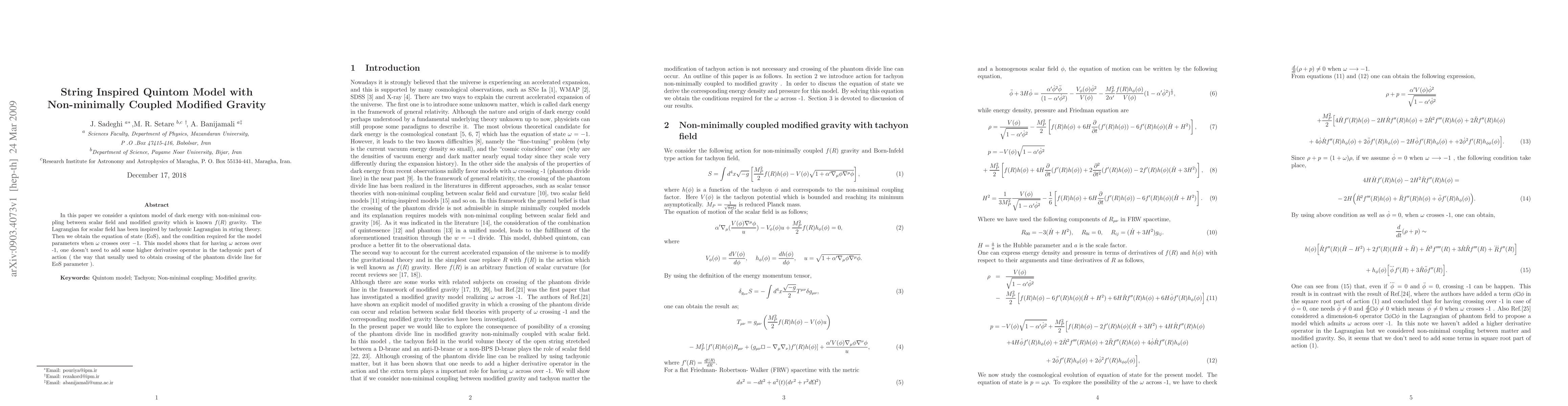 In this paper we consider a quintom model of dark energy with non-minimal coupling between scalar field and modified gravity which is known $f(R)$ gravity. The Lagrangian for scalar field has been inspired by tachyonic Lagrangian in string theory. Then we obtain the equation of state (EoS), and the condition required for the model parameters when $\omega$ crosses over -1. This model shows that for having $\omega$ across over -1, one doesn't need to add some higher derivative operator in the tachyonic part of action (the way that usually used to obtain crossing of the phantom divide line for EoS parameter).