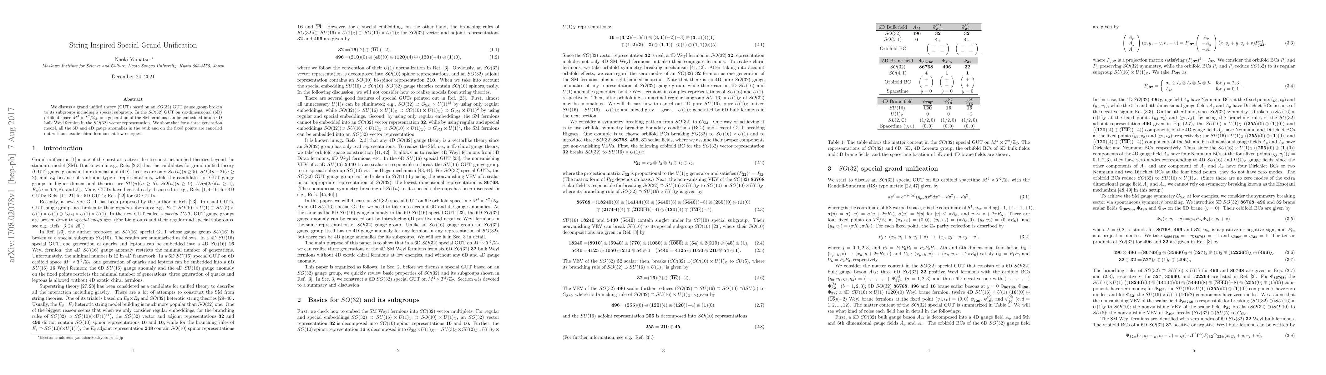 We discuss a grand unified theory (GUT) based on an $SO(32)$ GUT gauge group broken to its subgroups including a special subgroup. In the $SO(32)$ GUT on six-dimensional (6D) orbifold space $M^4\times T^2/\mathbb{Z}_2$, one generation of the SM fermions can be embedded into a 6D bulk Weyl fermion in the $SO(32)$ vector representation. We show that for a three generation model, all the 6D and 4D gauge anomalies in the bulk and on the fixed points are canceled out without exotic chiral fermions at low energies.
