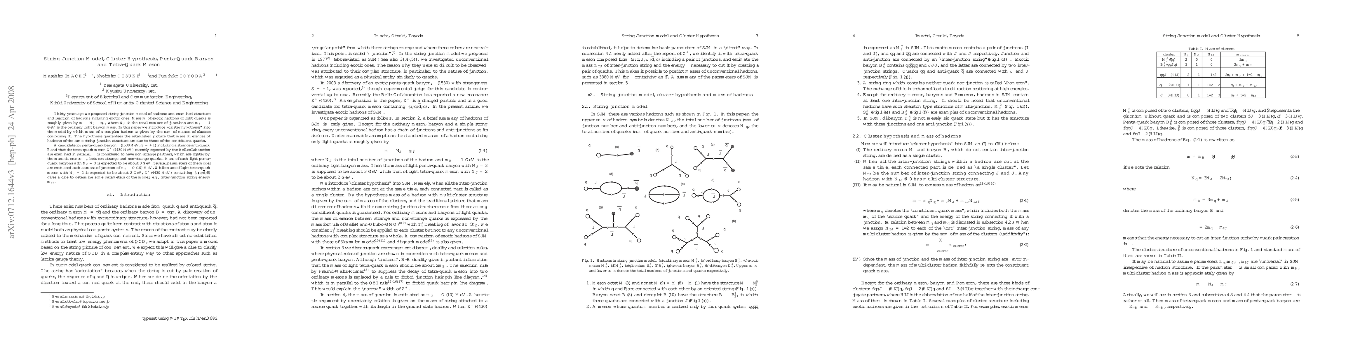 This paper revisits the string junction model of hadrons, introducing a "cluster hypothesis" where hadron mass is the sum of the masses of its constituent clusters. It examines exotic hadrons, including a penta-quark baryon $\Theta$(1530 MeV) and a tetra-quark meson $Z^+$(4430 MeV), estimating their masses and parameters like inter-junction string energy.