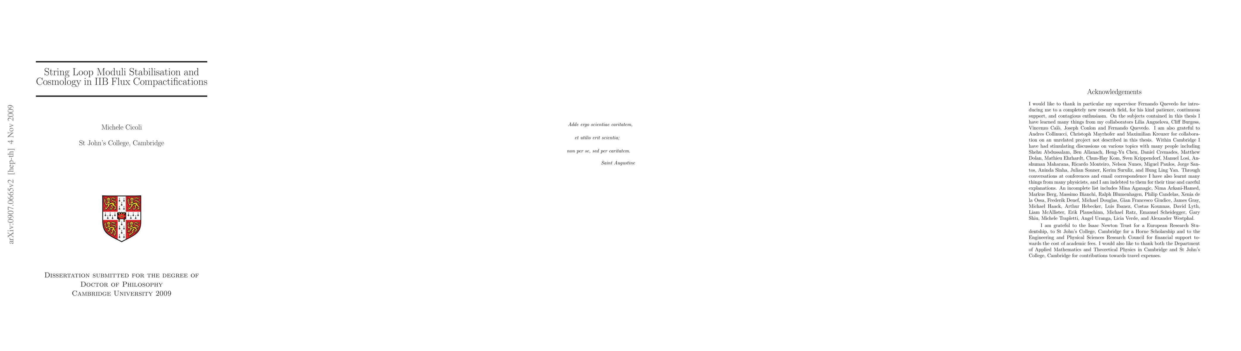 This paper investigates moduli stabilisation in type IIB Calabi-Yau flux compactifications, focusing on the LARGE Volume Scenario, and demonstrates the crucial role of string loop corrections in achieving full stabilisation. It also explores cosmological implications, including an inflationary model predicting observable gravity waves.