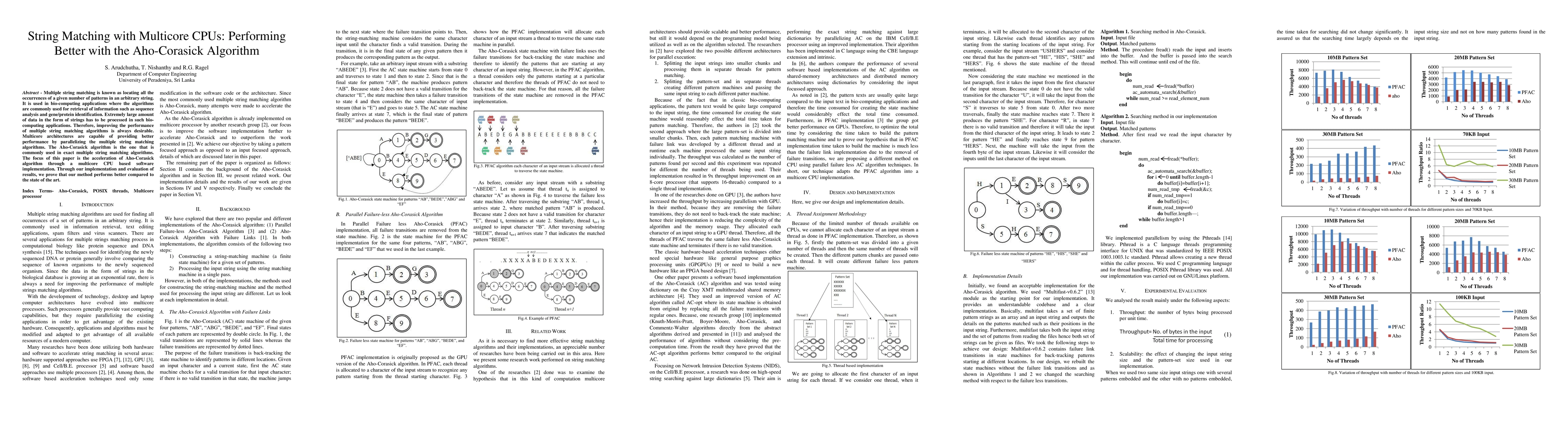 This paper explores the acceleration of the Aho-Corasick algorithm for multiple string matching on multicore CPUs, demonstrating improved performance through parallelization. The study shows that the proposed multicore implementation outperforms existing methods, especially in bio-computing applications involving large-scale sequence analysis.