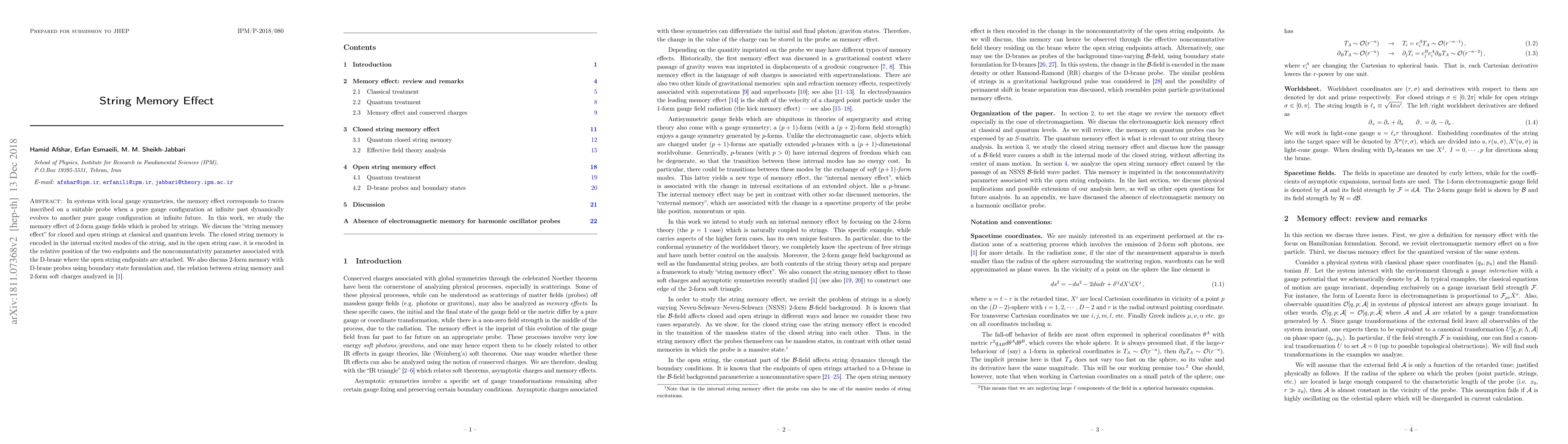 In systems with local gauge symmetries, the memory effect corresponds to traces inscribed on a suitable probe when a pure gauge configuration at infinite past dynamically evolves to another pure gauge configuration at infinite future. In this work, we study the memory effect of 2-form gauge fields which is probed by strings. We discuss the "string memory effect" for closed and open strings at classical and quantum levels. The closed string memory is encoded in the internal excited modes of the string, and in the open string case, it is encoded in the relative position of the two endpoints and the noncommutativity parameter associated with the D-brane where the open string endpoints are attached. We also discuss 2-form memory with D-brane probes using boundary state formulation and, the relation between string memory and 2-form soft charges analyzed in [1].