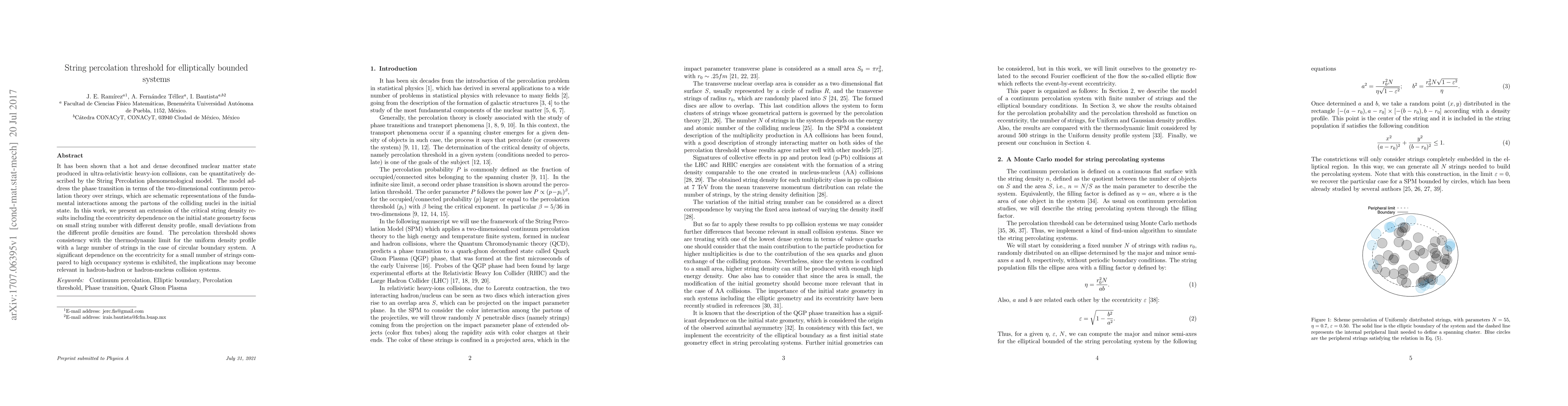 This paper extends the String Percolation model to elliptically bounded systems, finding that the percolation threshold is consistent with the thermodynamic limit for uniform density profiles with many strings but shows significant eccentricity dependence for systems with fewer strings. The results have implications for understanding phase transitions in hadron-hadron or hadron-nucleus collisions.