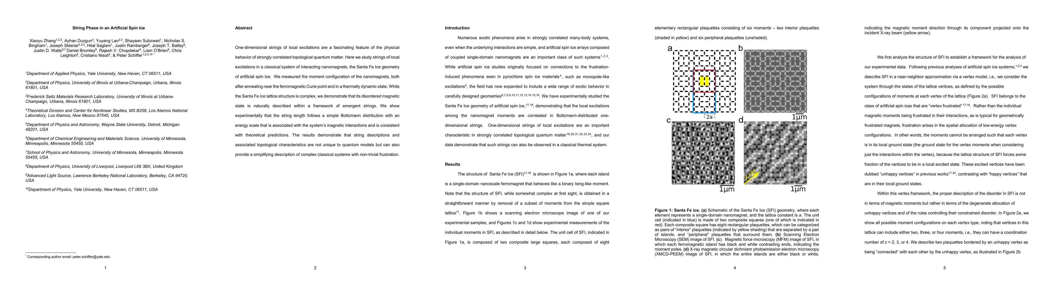 One-dimensional strings of local excitations are a fascinating feature of the physical behavior of strongly correlated topological quantum matter. Here we study strings of local excitations in a classical system of interacting nanomagnets, the Santa Fe Ice geometry of artificial spin ice. We measured the moment configuration of the nanomagnets, both after annealing near the ferromagnetic Curie point and in a thermally dynamic state. While the Santa Fe Ice lattice structure is complex, we demonstrate that its disordered magnetic state is naturally described within a framework of emergent strings. We show experimentally that the string length follows a simple Boltzmann distribution with an energy scale that is associated with the system's magnetic interactions and is consistent with theoretical predictions. The results demonstrate that string description and associated topological characteristics are not unique to quantum models but can also provide a simplifying description of complex classical systems with non-trivial frustration.