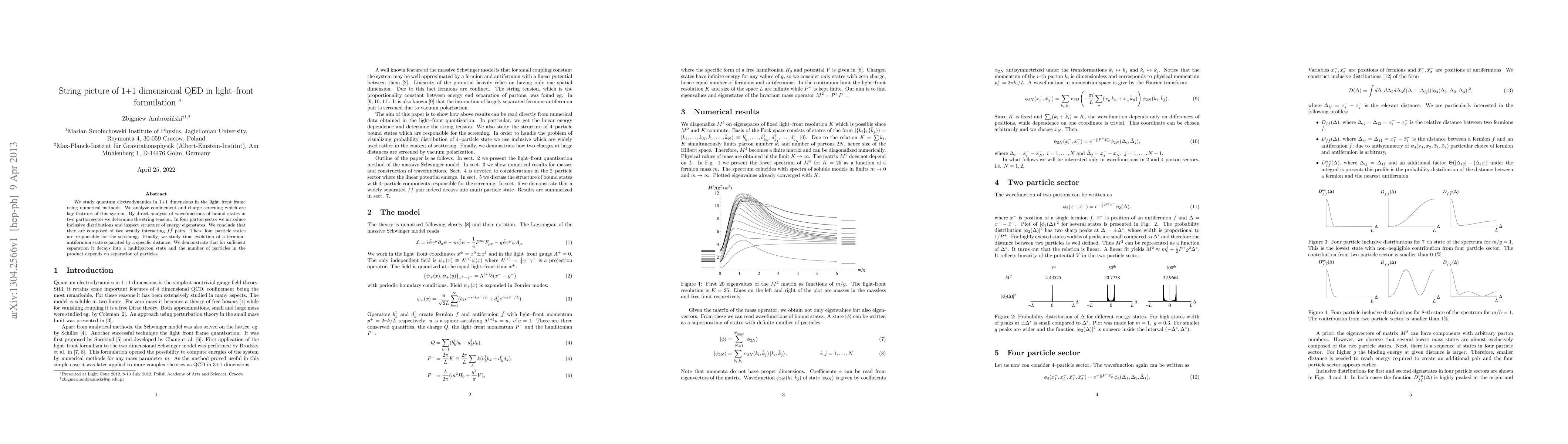 We study quantum electrodynamics in 1+1 dimensions in the light--front frame using numerical methods. We analyze confinement and charge screening which are key features of this system. By direct analysis of wavefunctions of bound states in two parton sector we determine the string tension. In four parton sector we introduce inclusive distributions and inspect structure of energy eigenstates. We conclude that they are composed of two weakly interacting $f\bar f$ pairs. These four particle states are responsible for the screening. Finally, we study time evolution of a fermion--antifermion state separated by a specific distance. We demonstrate that for sufficient separation it decays into a multiparton state and the number of particles in the product depends on separation of particles.