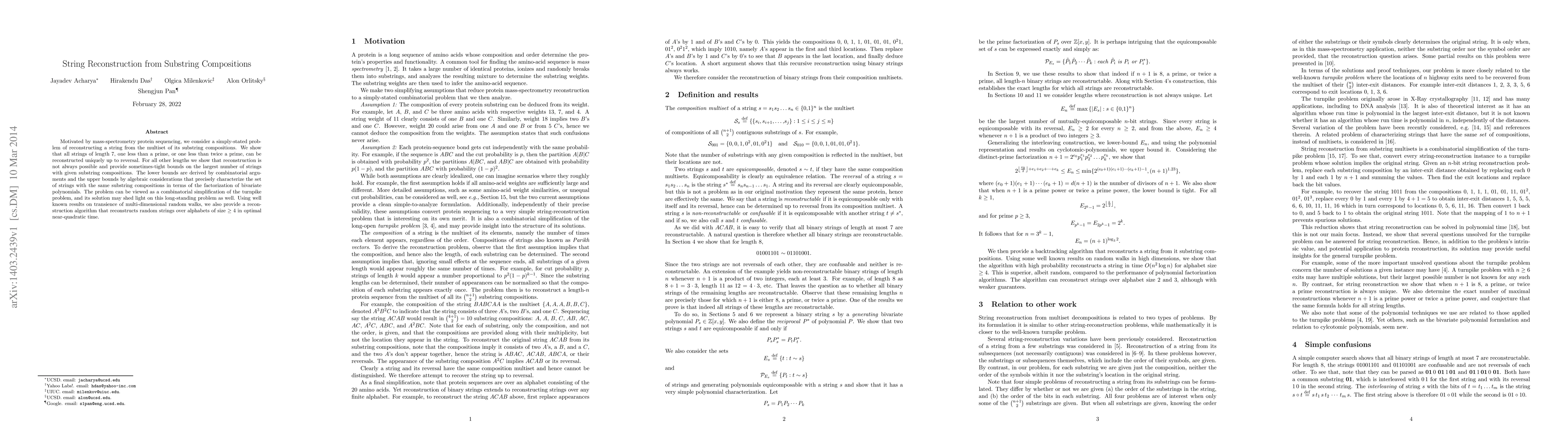 This paper addresses the problem of reconstructing a string from its substring compositions, motivated by protein sequencing via mass-spectrometry. It demonstrates that certain string lengths can be uniquely reconstructed, while others cannot, providing bounds on the number of possible strings for various lengths.