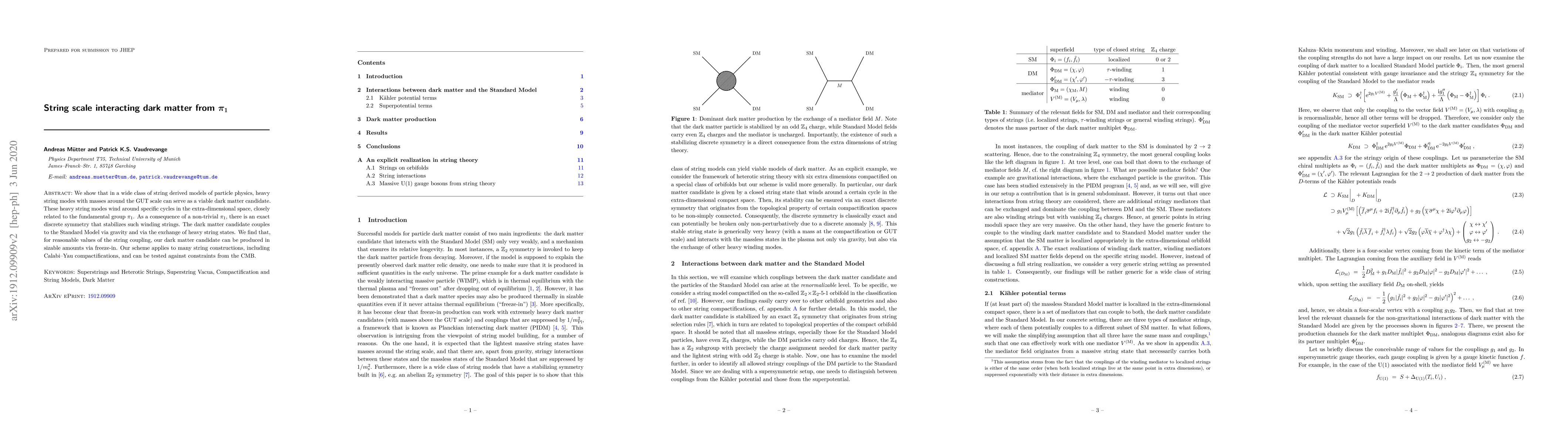 We show that in a wide class of string derived models of particle physics, heavy string modes with masses around the GUT scale can serve as a viable dark matter candidate. These heavy string modes wind around specific cycles in the extra-dimensional space, closely related to the fundamental group $\pi_1$. As a consequence of a non-trivial $\pi_1$, there is an exact discrete symmetry that stabilizes such winding strings. The dark matter candidate couples to the Standard Model via gravity and via the exchange of heavy string states. We find that, for reasonable values of the string coupling, our dark matter candidate can be produced in sizable amounts via freeze-in. Our scheme applies to many string constructions, including Calabi-Yau compactifications, and can be tested against constraints from the CMB.