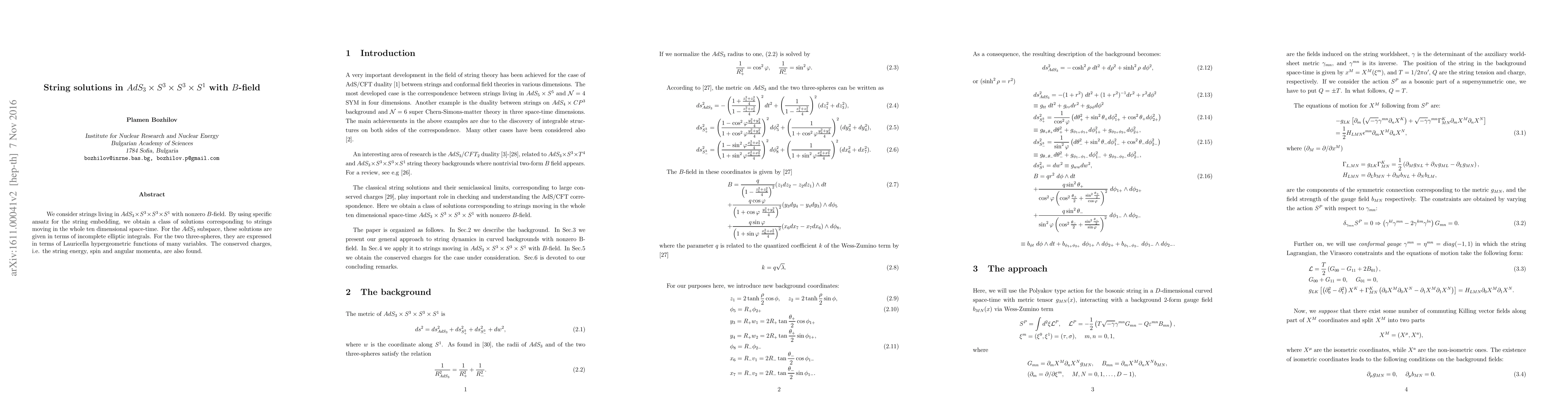 We consider strings living in $AdS_3\times S^3\times S^3\times S^1$ with nonzero $B$-field. By using specific ansatz for the string embedding, we obtain a class of solutions corresponding to strings moving in the whole ten dimensional space-time. For the $AdS_3$ subspace, these solutions are given in terms of incomplete elliptic integrals. For the two three-spheres, they are expressed in terms of Lauricella hypergeometric functions of many variables. The conserved charges, i.e. the string energy, spin and angular momenta, are also found.