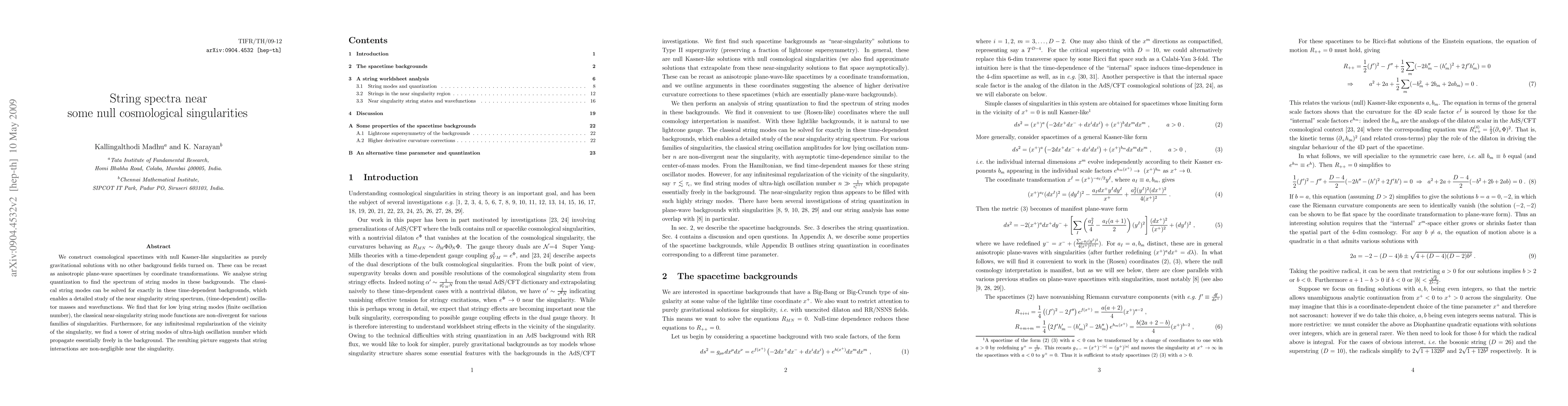 We construct cosmological spacetimes with null Kasner-like singularities as purely gravitational solutions with no other background fields turned on. These can be recast as anisotropic plane-wave spacetimes by coordinate transformations. We analyse string quantization to find the spectrum of string modes in these backgrounds. The classical string modes can be solved for exactly in these time-dependent backgrounds, which enables a detailed study of the near singularity string spectrum, (time-dependent) oscillator masses and wavefunctions. We find that for low lying string modes(finite oscillation number), the classical near-singularity string mode functions are non-divergent for various families of singularities. Furthermore, for any infinitesimal regularization of the vicinity of the singularity, we find a tower of string modes of ultra-high oscillation number which propagate essentially freely in the background. The resulting picture suggests that string interactions are non-negligible near the singularity.