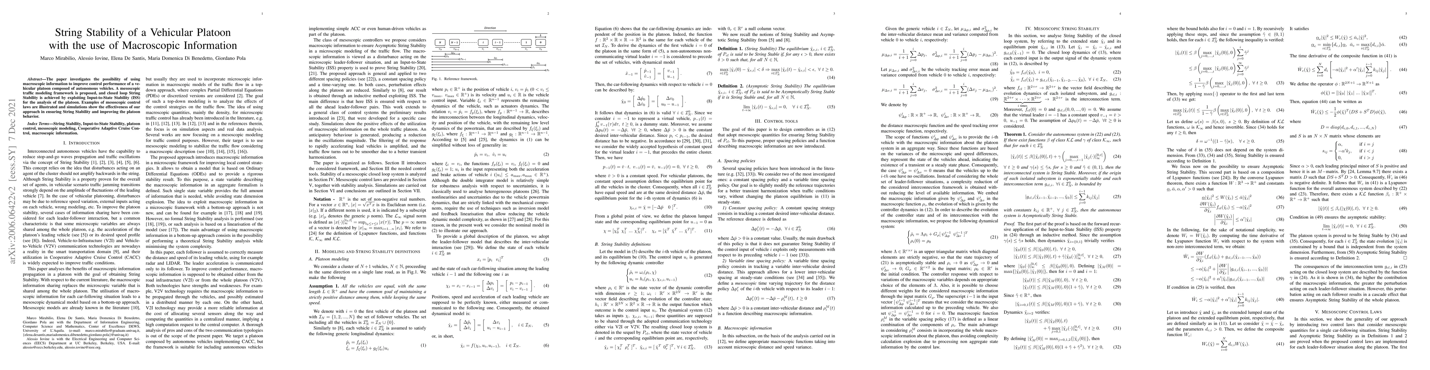 We investigate the possibility to use macroscopic information to improve control performance of a vehicular platoon composed of autonomous vehicles. A general mesoscopic traffic modeling is described, and a closed loop String Stability analysis is performed using Input-to-State Stability (ISS) results. Examples of mesoscopic control laws are provided and shown to ensure String Stability properties. Simulations are implementedin order to validate the control laws and to show the efficacy of the proposed approach.