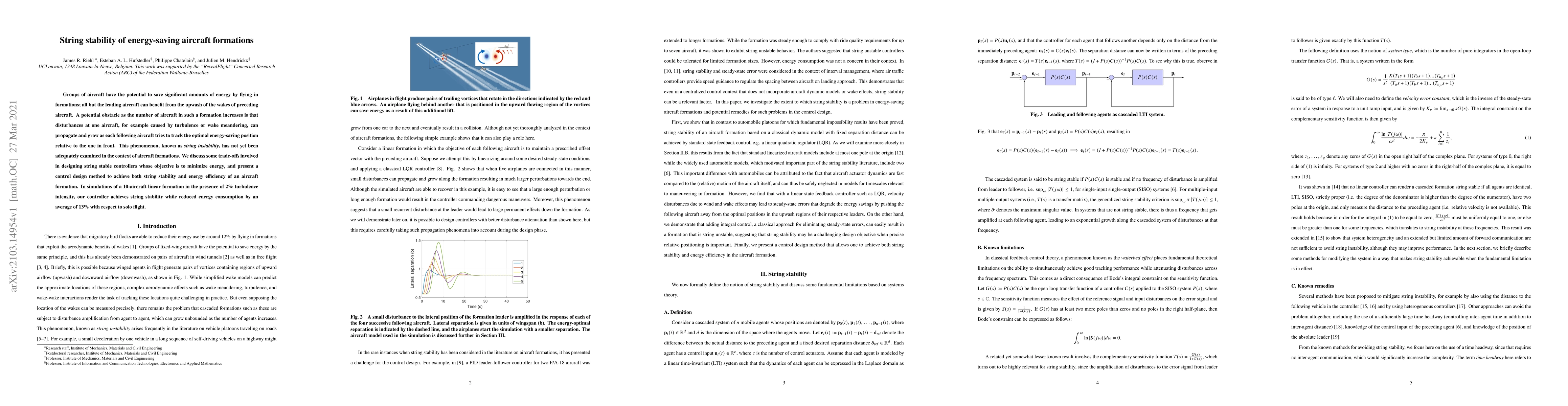 Groups of aircraft have the potential to save significant amounts of energy by flying in formations; all but the leading aircraft can benefit from the upwash of the wakes of preceding aircraft. A potential obstacle as the number of aircraft in such a formation increases is that disturbances at one aircraft, for example caused by turbulence or wake meandering, can propagate and grow as each following aircraft tries to track the optimal energy-saving position relative to the one in front. This phenomenon, known as string instability, has not yet been adequately examined in the context of aircraft formations. We discuss some trade-offs involved in designing string stable controllers whose objective is to minimize energy, and present a control design method to achieve both string stability and energy efficiency of an aircraft formation. In simulations of a 10-aircraft linear formation in the presence of 2% turbulence intensity, our controller achieves string stability while reduced energy consumption by an average of 13% with respect to solo flight.