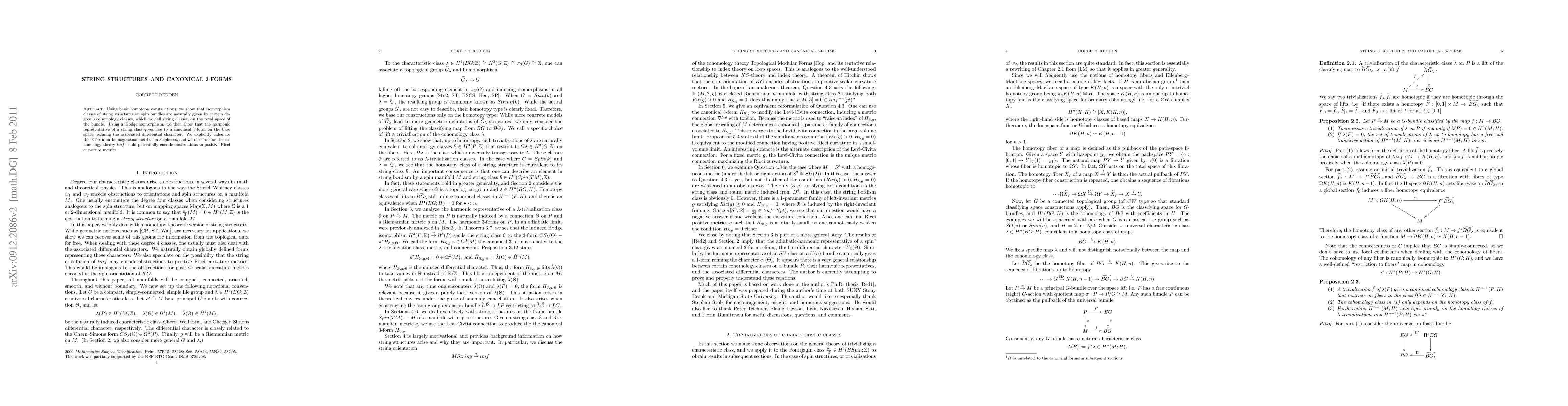 Using basic homotopy constructions, we show that isomorphism classes of string structures on spin bundles are naturally given by certain degree 3 cohomology classes, which we call string classes, on the total space of the bundle. Using a Hodge isomorphism, we then show that the harmonic representative of a string class gives rise to a canonical 3-form on the base space, refining the associated differential character. We explicitly calculate this 3-form for homogeneous metrics on 3-spheres, and we discuss how the cohomology theory tmf could potentially encode obstructions to positive Ricci curvature metrics.