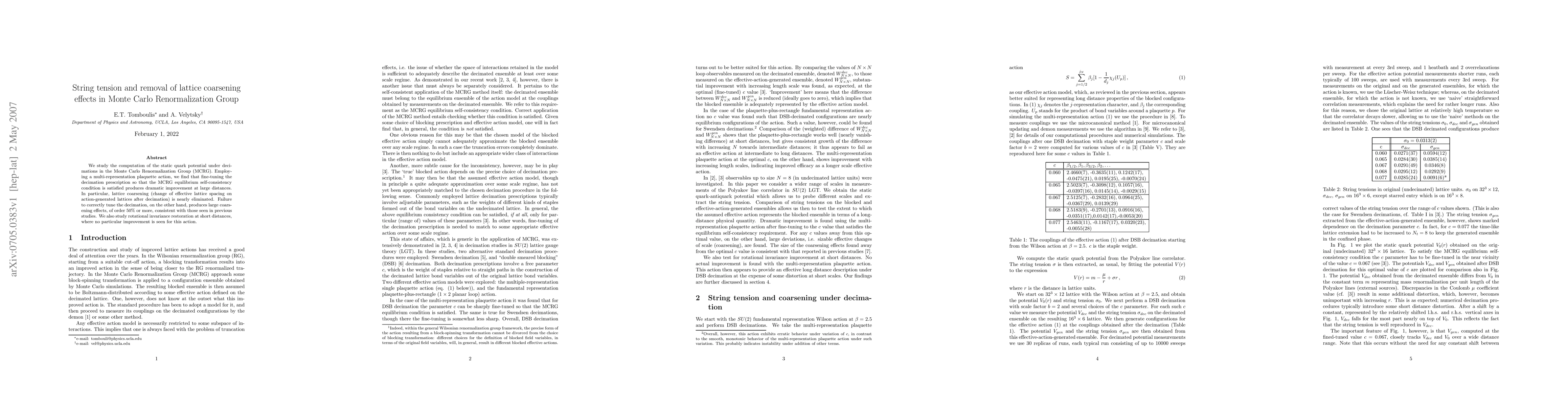We study the computation of the static quark potential under decimations in the Monte Carlo Renormalization Group (MCRG). Employing a multi-representation plaquette action, we find that fine-tuning the decimation prescription so that the MCRG equilibrium self-consistency condition is satisfied produces dramatic improvement at large distances. In particular, lattice coarsening (change of effective lattice spacing on action-generated lattices after decimation) is nearly eliminated. Failure to correctly tune the decimation, on the other hand, produces large coarsening effects, of order 50% or more, consistent with those seen in previous studies. We also study rotational invariance restoration at short distances, where no particular improvement is seen for this action.