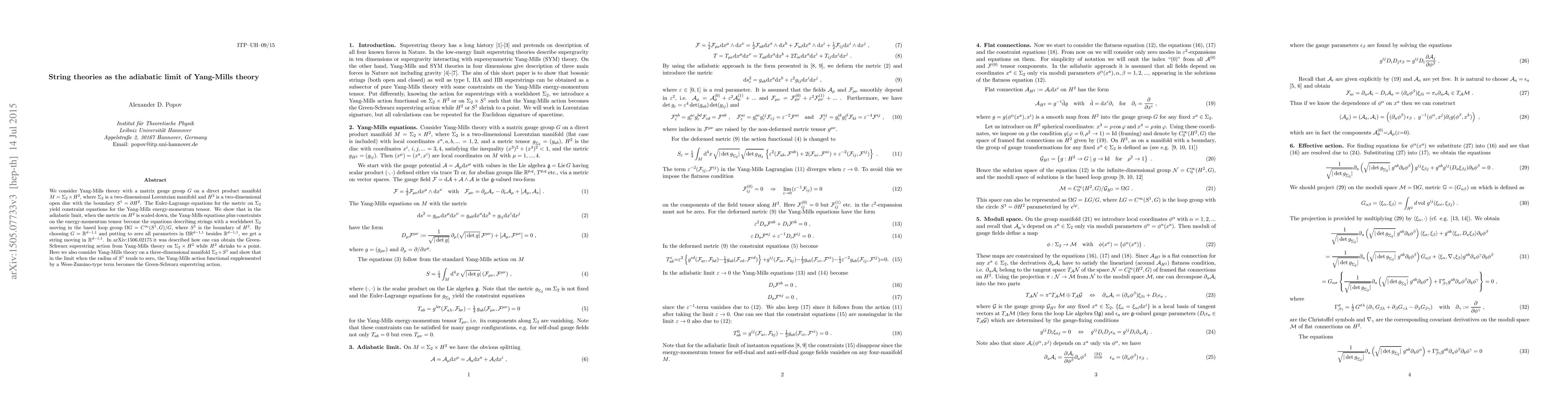 We consider Yang-Mills theory with a matrix gauge group $G$ on a direct product manifold $M=\Sigma_2\times H^2$, where $\Sigma_2$ is a two-dimensional Lorentzian manifold and $H^2$ is a two-dimensional open disc with the boundary $S^1=\partial H^2$. The Euler-Lagrange equations for the metric on $\Sigma_2$ yield constraint equations for the Yang-Mills energy-momentum tensor. We show that in the adiabatic limit, when the metric on $H^2$ is scaled down, the Yang-Mills equations plus constraints on the energy-momentum tensor become the equations describing strings with a worldsheet $\Sigma_2$ moving in the based loop group $\Omega G=C^\infty (S^1, G)/G$, where $S^1$ is the boundary of $H^2$. By choosing $G=R^{d-1, 1}$ and putting to zero all parameters in $\Omega R^{d-1, 1}$ besides $R^{d-1, 1}$, we get a string moving in $R^{d-1, 1}$. In arXiv:1506.02175 it was described how one can obtain the Green-Schwarz superstring action from Yang-Mills theory on $\Sigma_2\times H^2$ while $H^2$ shrinks to a point. Here we also consider Yang-Mills theory on a three-dimensional manifold $\Sigma_2\times S^1$ and show that in the limit when the radius of $S^1$ tends to zero, the Yang-Mills action functional supplemented by a Wess-Zumino-type term becomes the Green-Schwarz superstring action.