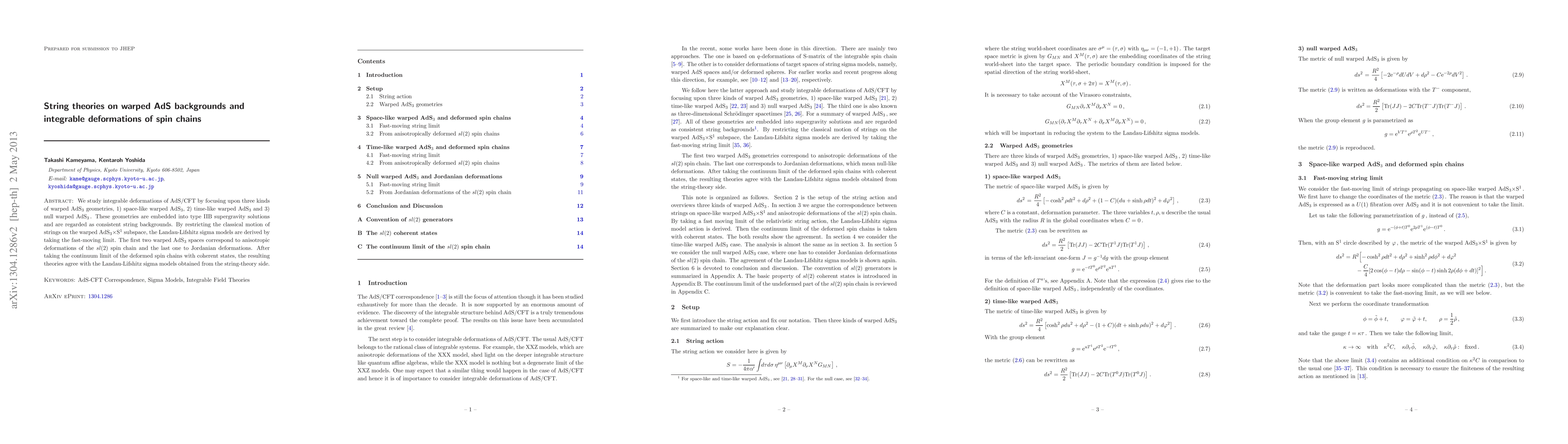 We study integrable deformations of AdS/CFT by focusing upon three kinds of warped AdS_3 geometries, 1) space-like warped AdS_3, 2) time-like warped AdS_3 and 3) null warped AdS_3. These geometries are embedded into type IIB supergravity solutions and are regarded as consistent string backgrounds. By restricting the classical motion of strings on the warped AdS_3xS^1 subspace, the Landau-Lifshitz sigma models are derived by taking the fast-moving limit. The first two warped AdS_3 spaces correspond to anisotropic deformations of the sl(2) spin chain and the last one to Jordanian deformations. After taking the continuum limit of the deformed spin chains with coherent states, the resulting theories agree with the Landau-Lifshitz sigma models obtained from the string-theory side.
