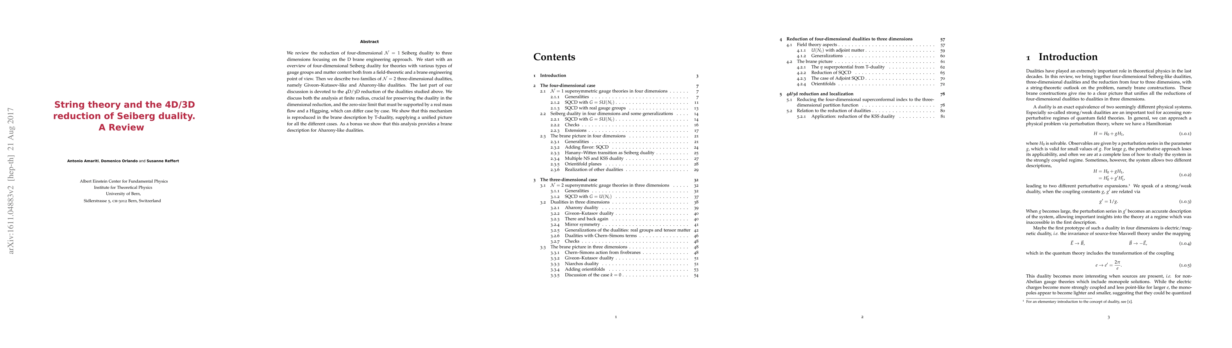 We review the reduction of four-dimensional N=1 Seiberg duality to three dimensions focusing on the D brane engineering approach. We start with an overview of four-dimensional Seiberg duality for theories with various types of gauge groups and matter content both from a field-theoretic and a brane engineering point of view. Then we describe two families of N=2 three-dimensional dualities, namely Giveon-Kutasov-like and Aharony-like dualities. The last part of our discussion is devoted to the 4D/3D reduction of the dualities studied above. We discuss both the analysis at finite radius, crucial for preserving the duality in the dimensional reduction, and the zero-size limit that must be supported by a real mass flow and a Higgsing, which can differ case by case. We show that this mechanism is reproduced in the brane description by T-duality, supplying a unified picture for all the different cases. As a bonus we show that this analysis provides a brane description for Aharony-like dualities.