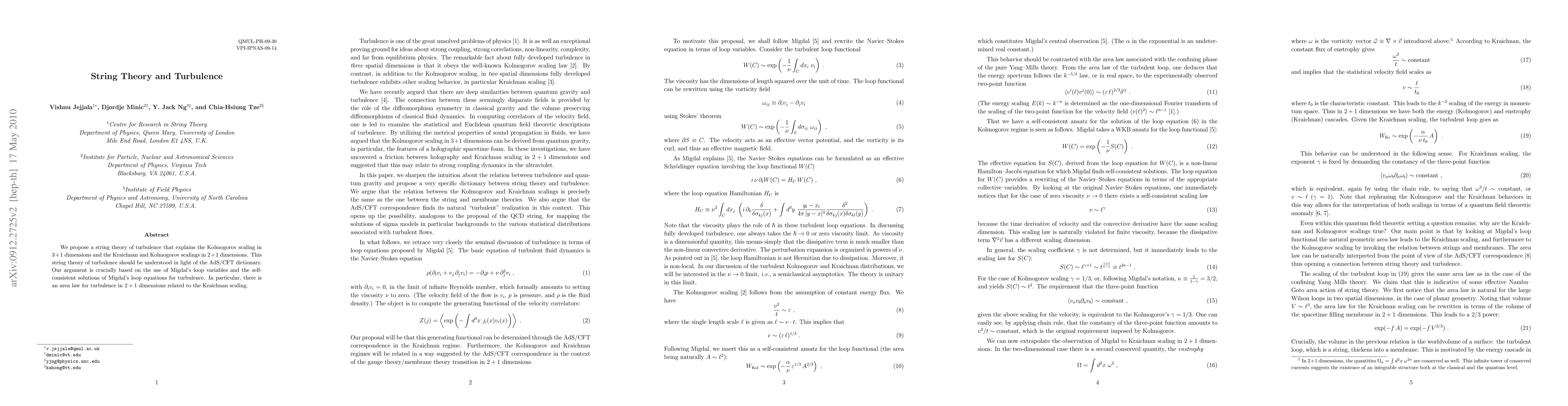 We propose a string theory of turbulence that explains the Kolmogorov scaling in 3+1 dimensions and the Kraichnan and Kolmogorov scalings in 2+1 dimensions. This string theory of turbulence should be understood in light of the AdS/CFT dictionary. Our argument is crucially based on the use of Migdal's loop variables and the self-consistent solutions of Migdal's loop equations for turbulence. In particular, there is an area law for turbulence in 2+1 dimensions related to the Kraichnan scaling.