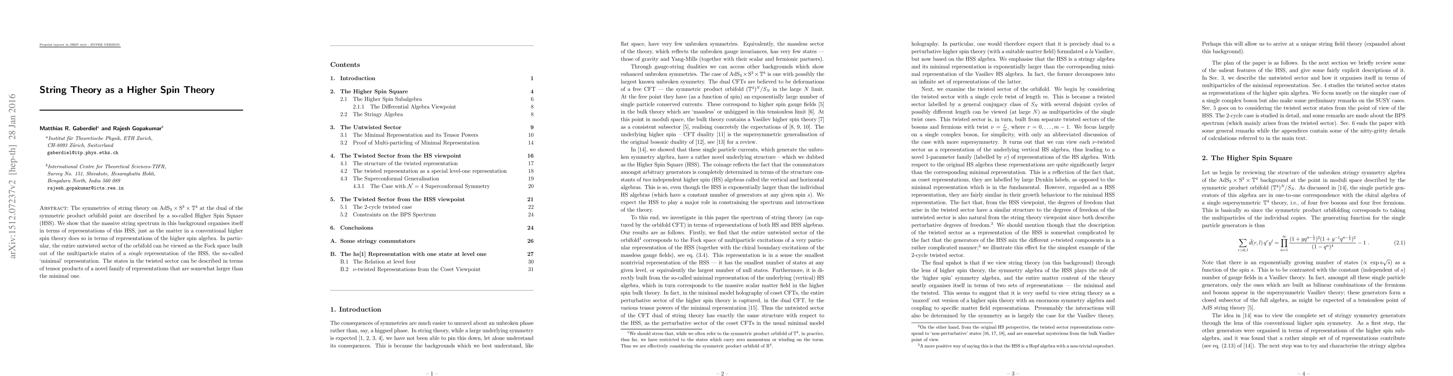The symmetries of string theory on ${\rm AdS}_3 \times {\rm S}^3 \times \mathbb{T}^4$ at the dual of the symmetric product orbifold point are described by a so-called Higher Spin Square (HSS). We show that the massive string spectrum in this background organises itself in terms of representations of this HSS, just as the matter in a conventional higher spin theory does so in terms of representations of the higher spin algebra. In particular, the entire untwisted sector of the orbifold can be viewed as the Fock space built out of the multiparticle states of a single representation of the HSS, the so-called `minimal' representation. The states in the twisted sector can be described in terms of tensor products of a novel family of representations that are somewhat larger than the minimal one.