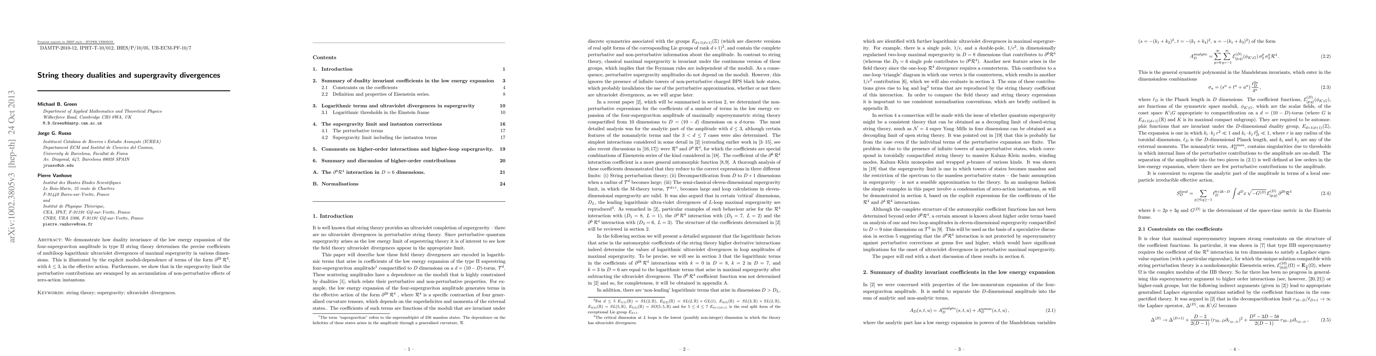 This paper reveals how string theory dualities dictate the coefficients of ultraviolet divergences in maximal supergravity, specifically through the moduli-dependence of terms involving D^{2k}R^4. It also highlights that perturbative contributions are overshadowed by non-perturbative effects from zero-action instantons in the supergravity limit.