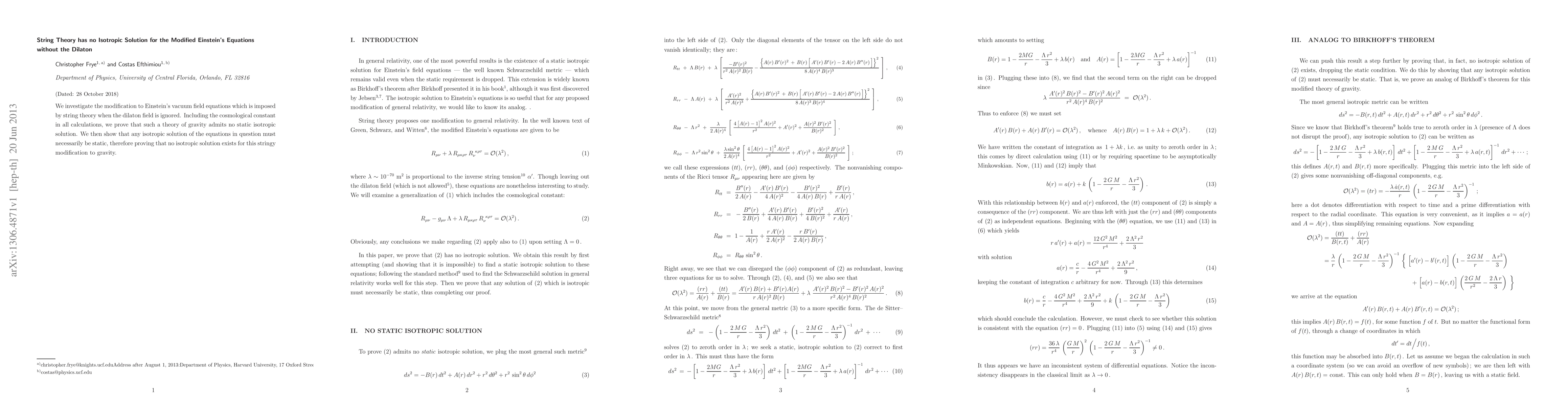 This paper demonstrates that string theory, when the dilaton field is omitted, leads to modified Einstein's vacuum field equations that do not admit any static isotropic solutions, even when including a cosmological constant. The authors conclude that no isotropic solution exists for this specific stringy modification of gravity.