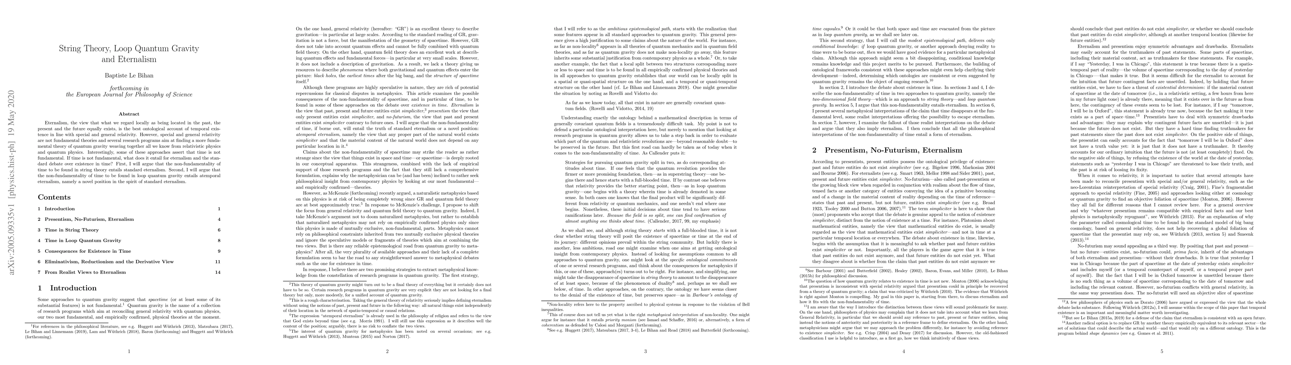 This paper explores the implications of non-fundamental time in string theory and loop quantum gravity for eternalism. It argues that string theory supports standard eternalism, while loop quantum gravity leads to a novel atemporal eternalism.