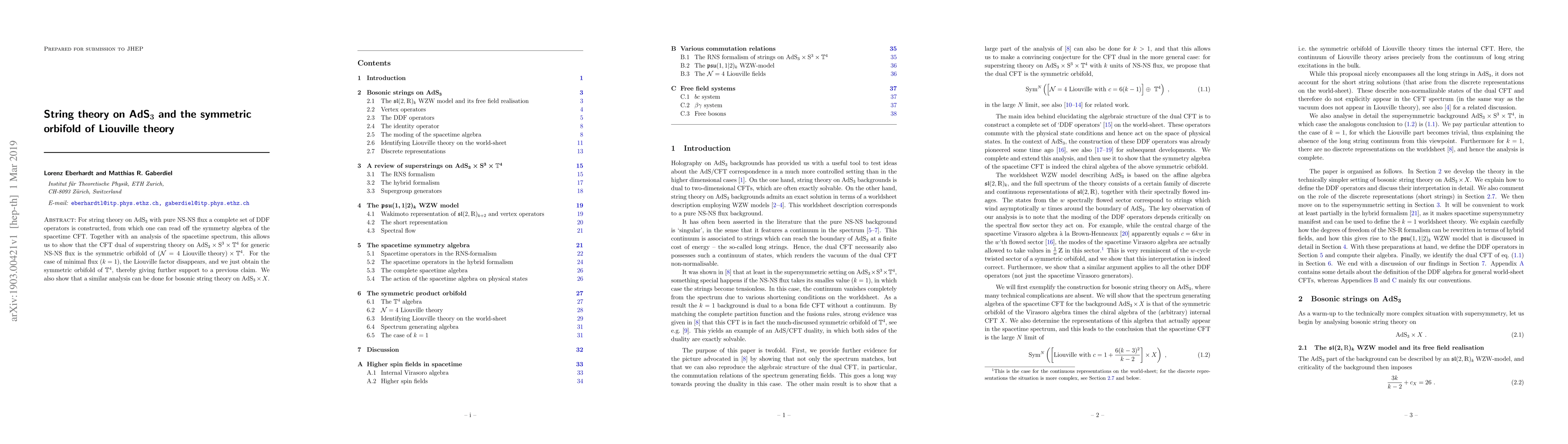 This paper constructs DDF operators for string theory on AdS$_3$ with NS-NS flux, linking them to the symmetry algebra of the conformal field theory (CFT) dual. It demonstrates that the CFT dual of superstring theory on AdS$_3$ × S$^3$ × T$^4$ is the symmetric orbifold of (N=4 Liouville theory) × T$^4$, providing further evidence for this duality when minimal flux is considered.