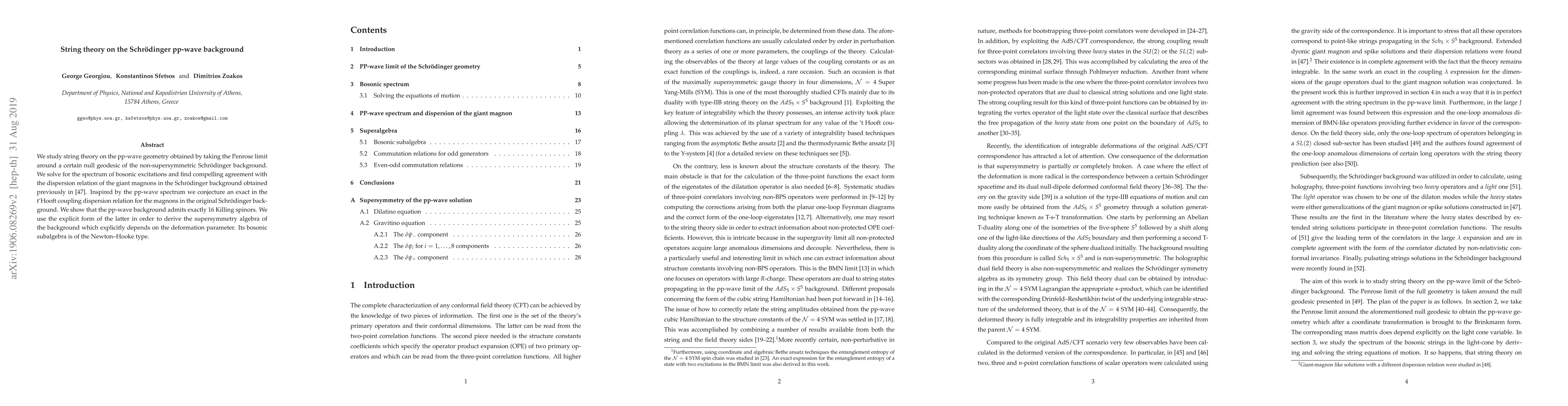 This paper examines string theory on a Schrodinger pp-wave background, deriving the spectrum of bosonic excitations and aligning it with previous findings on giant magnons. The study reveals an exact dispersion relation in the t'Hooft coupling and identifies 16 Killing spinors, leading to a Newton-Hooke type supersymmetry algebra.