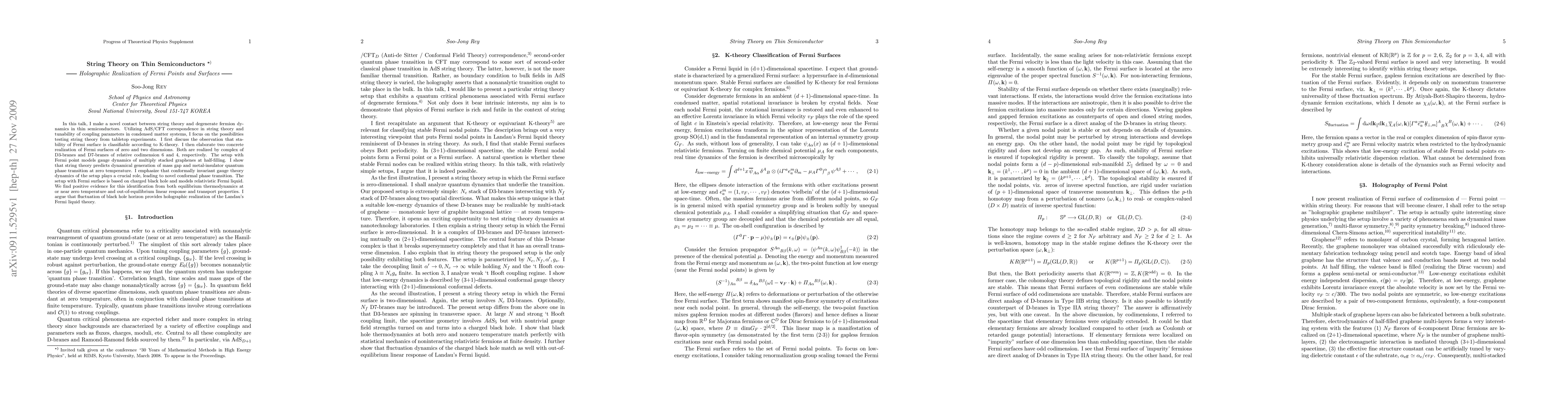 I make a novel contact between string theory and degenerate fermion dynamics in thin semiconductors. Utilizing AdS/CFT correspondence in string theory and tunability of coupling parameters in condensed matter systems, I focus on the possibilities testing string theory from tabletop experiments. I first discuss the observation that stability of Fermi surface is classifiable according to K-theory. I then elaborate two concrete realization of Fermi surfaces of zero and two dimensions. Both are realized by complex of D3-branes and D7-branes of relative codimension 6 and 4, respectively. The setup with Fermi point models gauge dynamics of multiply stacked graphenes at half-filling. I show that string theory predicts dynamical generation of mass gap and metal-insulator quantum phase transition at zero temperature. I emphasize that conformally invariant gauge theory dynamics of the setup plays a crucial role, leading to novel conformal phase transition. The setup with Fermi surface is in collaboration with Dongsu Bak and is based on charged black hole and models relativistic Fermi liquid. We find positive evidence for this identification from both equilibrium thermodynamics at or near zero temperature and out-of-equilibrium linear response and transport properties. I argue that fluctuation of black hole horizon provides holographic realization consistent with Fermi liquid for thermodynamics and interesting departures therefrom in transport properties.