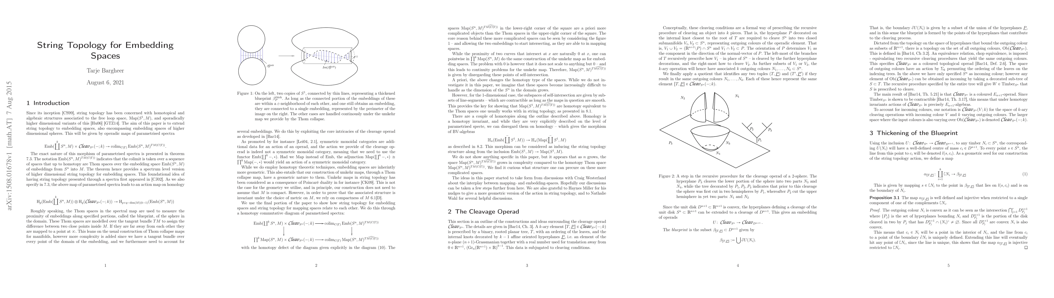 This paper extends string topology to embedding spaces $Emb(S^n,M)$, deriving an action from the cleavage operad. It analyzes the homology structure arising from the embedding and specializes to a BV-algebra morphism in the $1$-dimensional case.