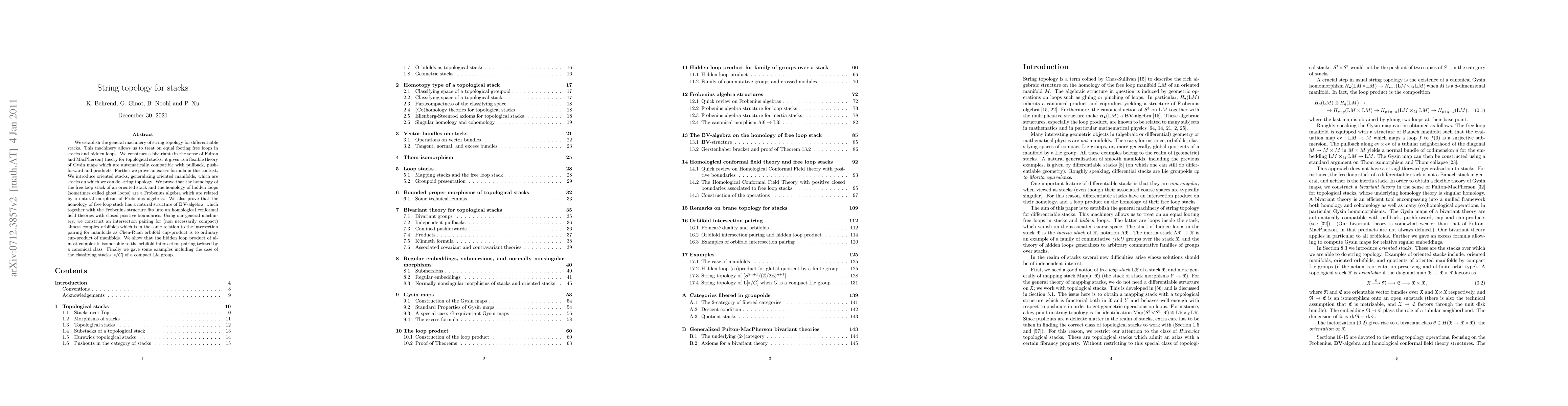 We establish the general machinery of string topology for differentiable stacks. This machinery allows us to treat on an equal footing free loops in stacks and hidden loops. In particular, we give a good notion of a free loop stack, and of a mapping stack $\map(Y,\XX)$, where $Y$ is a compact space and $\XX$ a topological stack, which is functorial both in $\XX$ and $Y$ and behaves well enough with respect to pushouts. We also construct a bivariant (in the sense of Fulton and MacPherson) theory for topological stacks: it gives us a flexible theory of Gysin maps which are automatically compatible with pullback, pushforward and products. Further we prove an excess formula in this context. We introduce oriented stacks, generalizing oriented manifolds, which are stacks on which we can do string topology. We prove that the homology of the free loop stack of an oriented stack and the homology of hidden loops (sometimes called ghost loops) are a Frobenius algebra which are related by a natural morphism of Frobenius algebras. We also prove that the homology of free loop stack has a natural structure of a BV-algebra, which together with the Frobenius structure fits into an homological conformal field theories with closed positive boundaries. Using our general machinery, we construct an intersection pairing for (non necessarily compact) almost complex orbifolds which is in the same relation to the intersection pairing for manifolds as Chen-Ruan orbifold cup-product is to ordinary cup-product of manifolds. We show that the hidden loop product of almost complex is isomorphic to the orbifold intersection pairing twisted by a canonical class. Finally we gave some examples including the case of the classifying stacks $[*/G]$ of a compact Lie group.