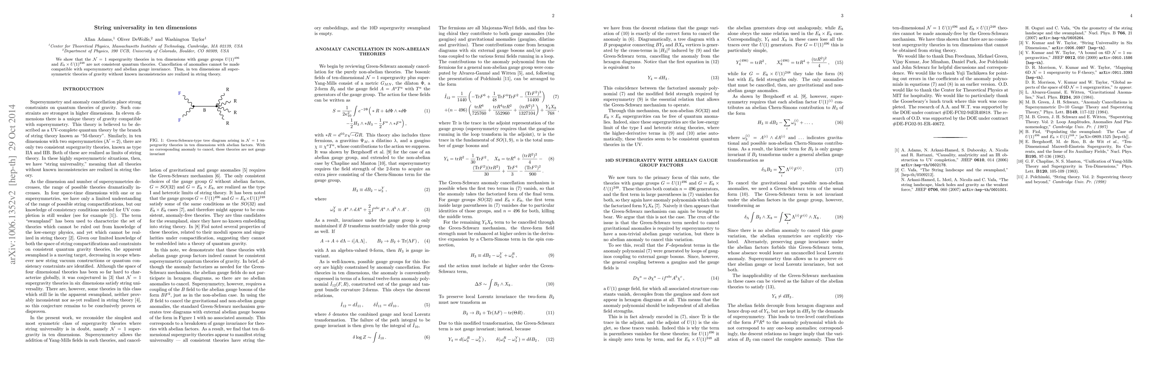We show that the ${\cal N}=1$ supergravity theories in ten dimensions with gauge groups $U(1)^{496}$ and $E_8 \times U(1)^{248}$ are not consistent quantum theories. Cancellation of anomalies cannot be made compatible with supersymmetry and abelian gauge invariance. Thus, in ten dimensions all supersymmetric theories of gravity without known inconsistencies are realized in string theory.