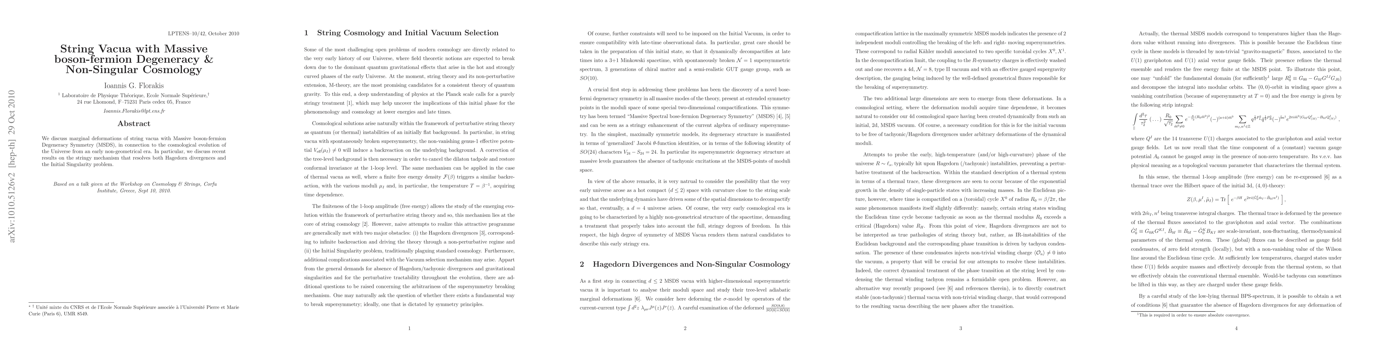 This paper explores marginal deformations in string vacua with Massive boson-fermion Degeneracy Symmetry (MSDS), focusing on their implications for a non-singular cosmological evolution, resolving Hagedorn divergences and the Initial Singularity problem. Presented at the Workshop on Cosmology & Strings in Corfu, Greece in 2010.