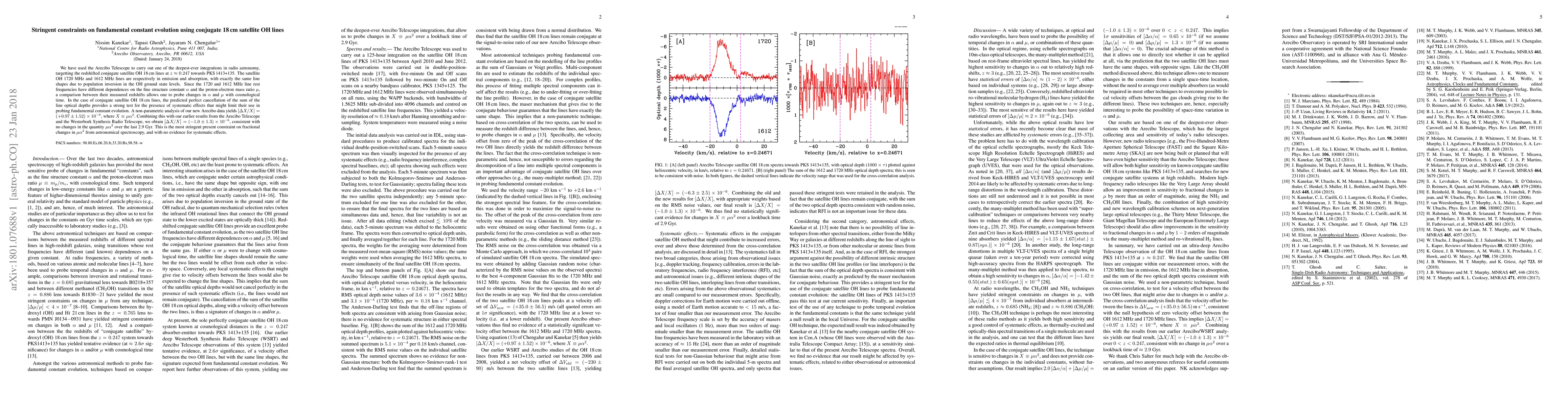 This study uses the Arecibo Telescope to observe redshifted OH lines from a satellite at $z \approx 0.247$, aiming to constrain the evolution of fundamental constants $\alpha$ and $\mu$. The results indicate no significant change in $\mu \alpha^2$ over the last 2.9 Gyr, providing the most stringent constraint to date.
