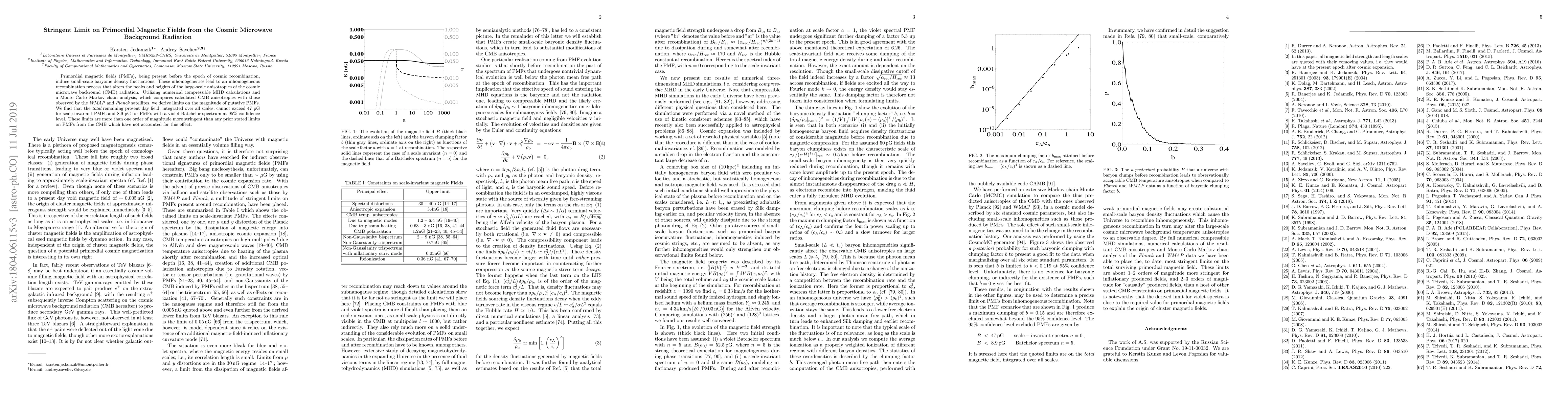 This paper sets stringent limits on primordial magnetic fields (PMFs) by analyzing the impact of PMFs on the cosmic microwave background (CMB) radiation. The study finds that the total present-day field cannot exceed 47 pG for scale-invariant PMFs and 8.9 pG for PMFs with a violet Batchelor spectrum, significantly tightening previous CMB-based limits.