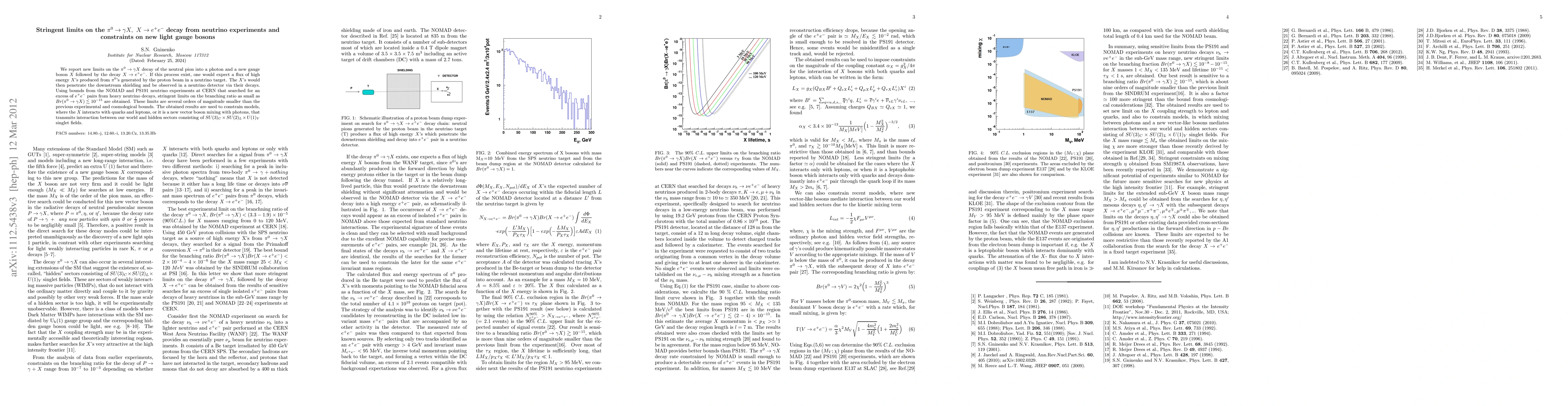 We report new experimental limits on the \pi^0 -> \gamma X decay of the neutral pion into a photon and a light boson X followed by the decay X -> e+e-. If this process exist, one would expect a flux of high energy X's produced from \pi^0's generated by the proton beam in a neutrino target. The X's would then penetrate the downstream shielding and be observed in a neutrino detector via their decays. Using bounds from the NOMAD and PS191 neutrino experiments at CERN that searched for an excess of e+e- pairs from heavy neutrino decays, stringent limits on the branching ratio as small as Br(\pi^0 -> \gamma X) < 10^{-15} are obtained. These limits are several orders of magnitude smaller than the previous experimental and cosmological bounds. The obtained results are used to constrain models, where the X interacts with quarks and leptons, or it is a new vector boson mixing with photons, that transmits interaction between our world and hidden sectors consisting of SU(3)_C x SU(2)_L x U(1)_Y singlet fields.