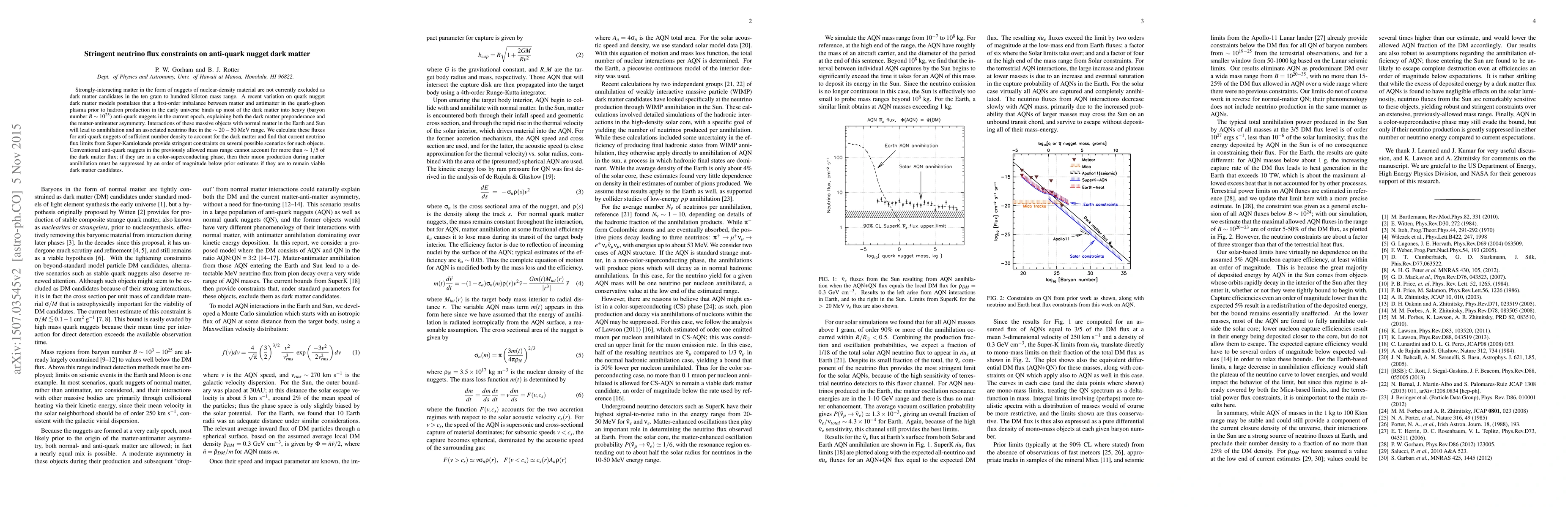 This paper investigates stringent neutrino flux constraints on anti-quark nugget dark matter, proposing that these nuggets could explain both dark matter abundance and matter-antimatter asymmetry. Current neutrino limits from Super-Kamiokande rule out conventional anti-quark nuggets in the usual mass range, requiring significant suppression of muon production for viability.
