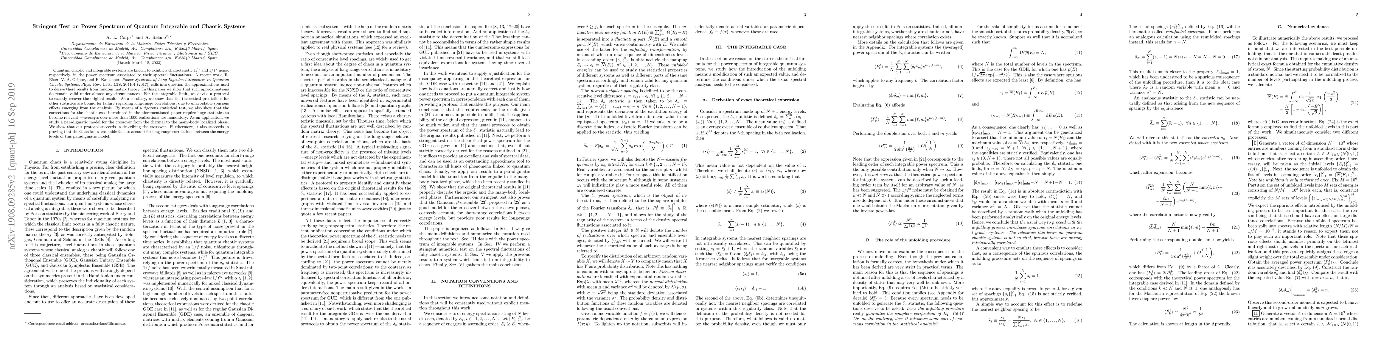 This paper rigorously tests the power spectrum of quantum integrable and chaotic systems, confirming the validity of approximations used to derive $1/f$ and $1/f^{2}$ noise results. It demonstrates that corrections for chaotic systems require extensive statistics, and applies the protocol to a model showing the crossover from thermal to many-body localized phase, proving the inadequacy of the Gaussian $\beta$-ensemble for long-range correlations.