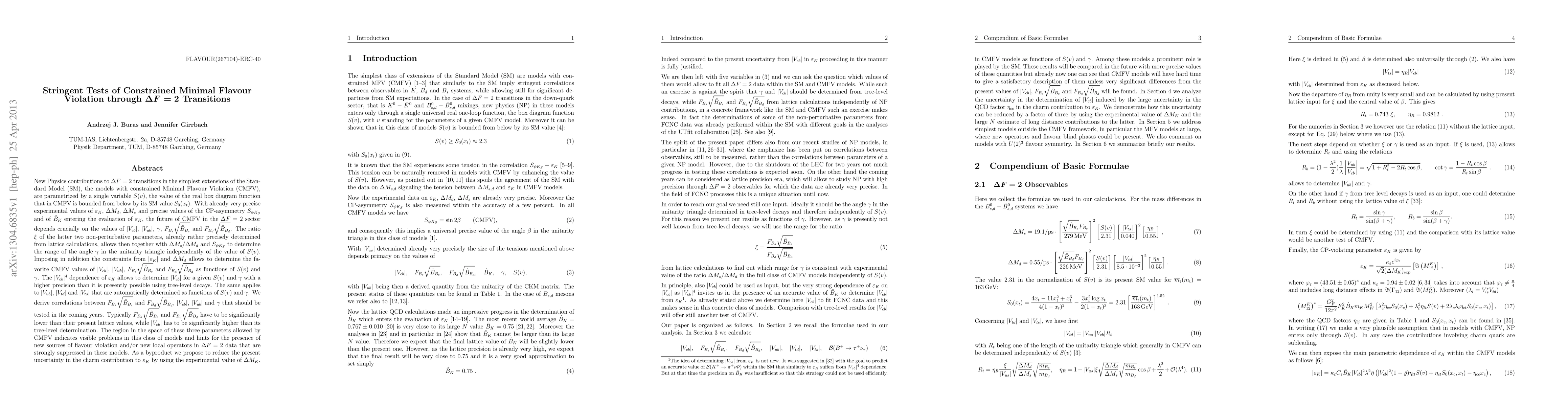 New Physics contributions to Delta F=2 transitions in models with constrained Minimal Flavour Violation (CMFV), are parametrized by a single variable S(v), the value of the real box diagram function. With already precise experimental values of epsilon_K, Delta M_d, Delta M_s, CP-asymmetry S_{psi K_S} and of hat{B}_K entering the evaluation of epsilon_K, the future of CMFV in the Delta F=2 sector depends crucially on the values of |Vcb|, |Vub|, gamma, F_{B_s} sqrt{hat B_{B_s}} and F_{B_d} sqrt{hat B_{B_d}}. The ratio xi of the latter two parameters, rather precisely determined from lattice calculations, allows then together with Delta M_s/Delta M_d and S_{psi K_S} to determine the range of gamma in the unitarity triangle independently of the value of S(v). Imposing in addition the constraints from epsilon_K and Delta M_d allows to determine the favorite CMFV values of |Vcb|, |Vub|, F_{B_s} sqrt{hat B_{B_s}} and F_{B_d} sqrt{hat B_{B_d}} as functions of S(v) and gamma. The |Vcb|^4 dependence of epsilon_K allows to determine |Vcb| for a given S(v) and gamma with a higher precision than it is presently possible using tree-level decays. The same applies to |Vub|, |Vtd| and |Vts| that are automatically determined as functions of S(v) and gamma. Typically F_{B_s}sqrt{hat B_{B_s}} and F_{B_d} sqrt{hat B_{B_d}} have to be significantly lower than their present lattice values, while |Vcb| has to be significantly higher than its tree-level determination. The region in the space of these three parameters allowed by CMFV indicates visible problems in this class of models and hints for the presence of new sources of flavour violation and/or new local operators in Delta F=2 data that are strongly suppressed in these models. As a byproduct we propose to reduce the present uncertainty in the charm contribution toepsilon_K by using the experimental value of Delta M_K.