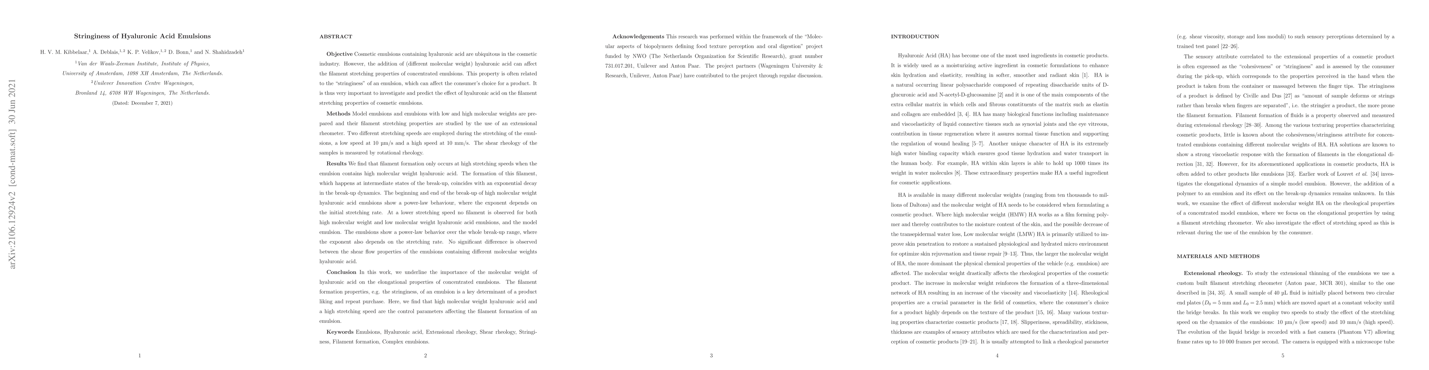 This research highlights the significance of hyaluronic acid molecular weight in determining the elongational properties of concentrated emulsions. High molecular weight hyaluronic acid and high stretching speeds are identified as crucial factors influencing filament formation, which impacts product preference and consumer repurchase.