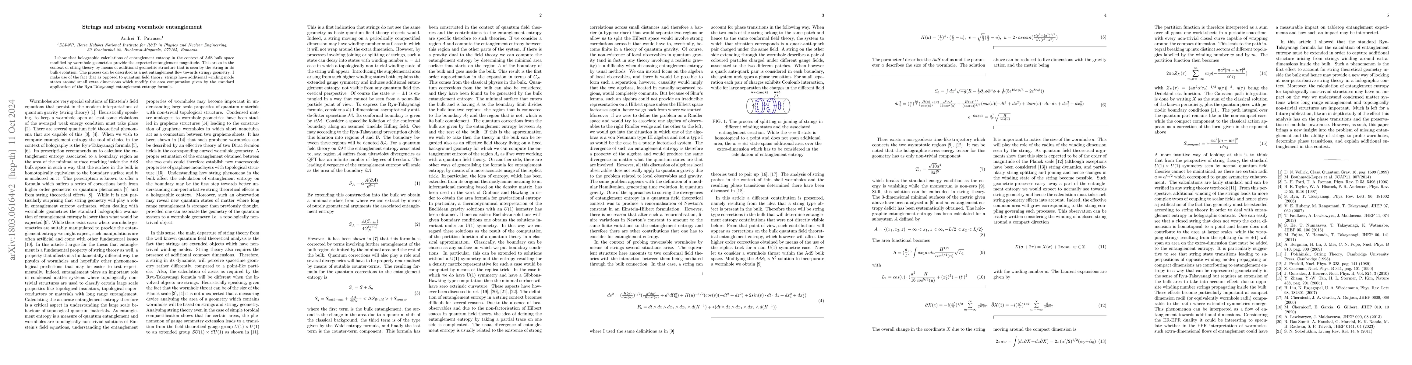 I show that holographic calculations of entanglement entropy in the context of AdS bulk space modified by wormhole geometries provide the expected entanglement magnitude. This arises in the context of string theory by means of additional geometric structure that is seen by the string in its bulk evolution. The process can be described as a net entanglement flow towards stringy geometry. I make use of the fact that as opposed to quantum field theory, strings have additional winding mode states around small extra dimensions which modify the area computation given by the standard application of the Ryu-Takayanagi entanglement entropy formula.